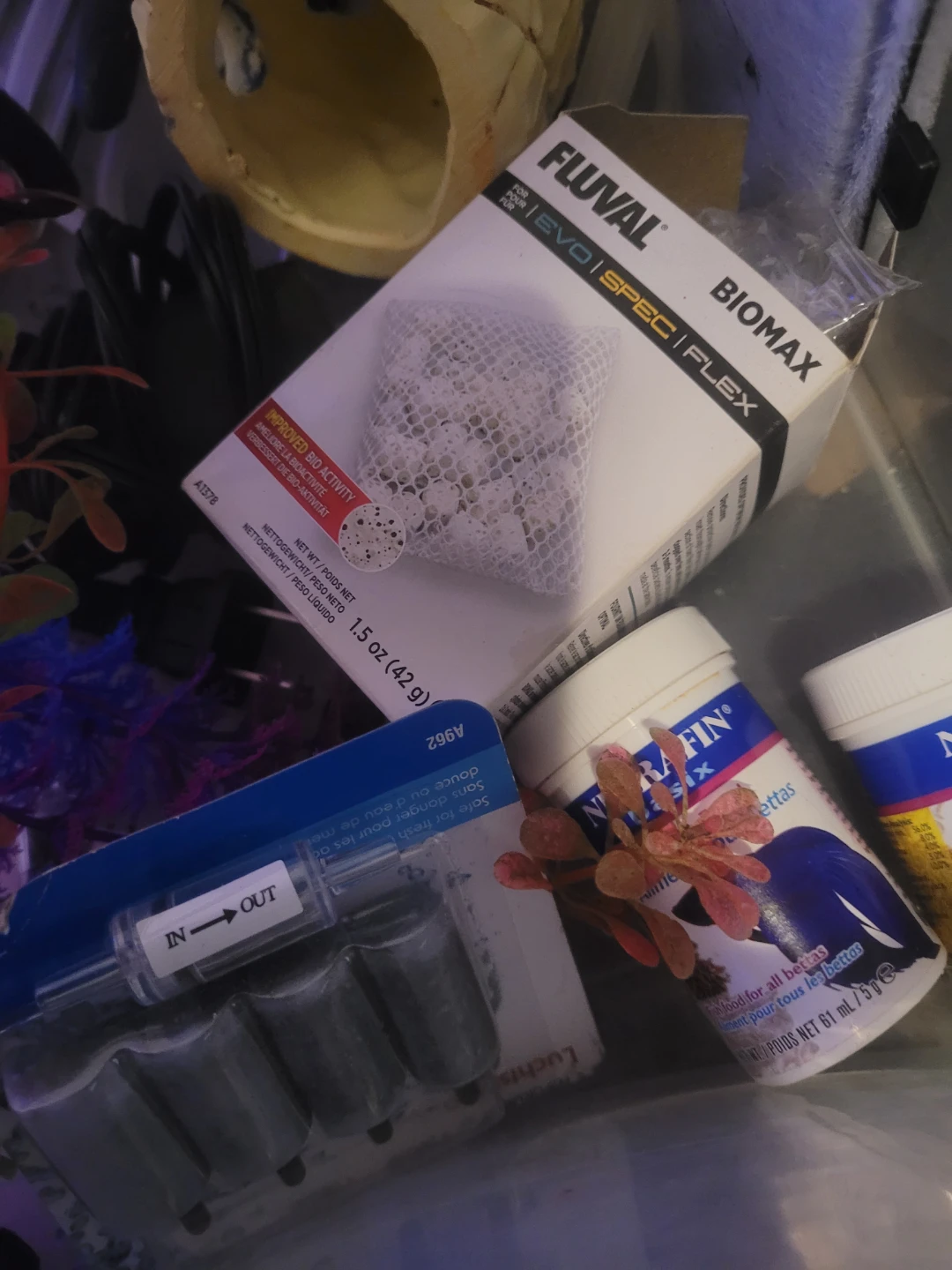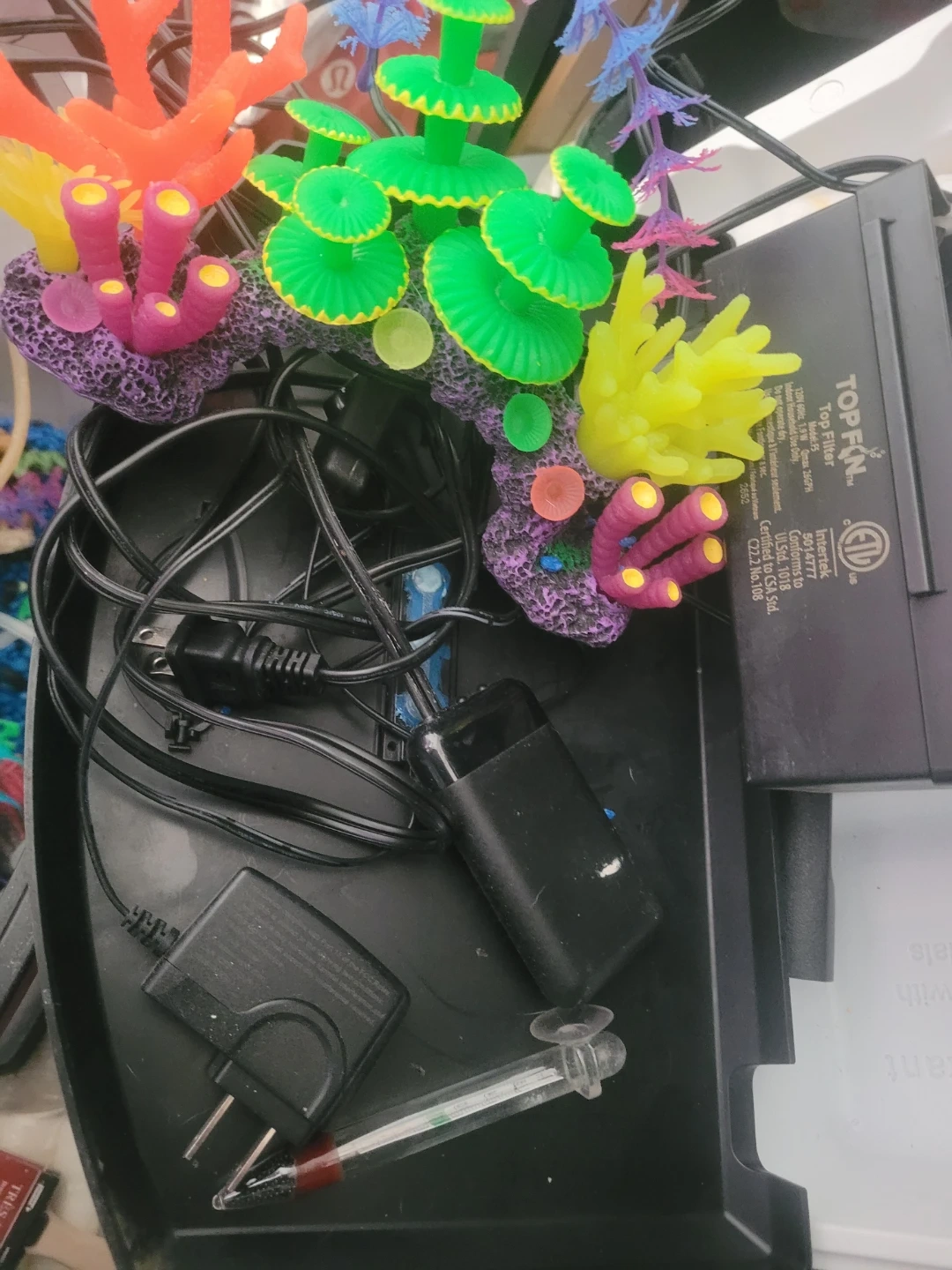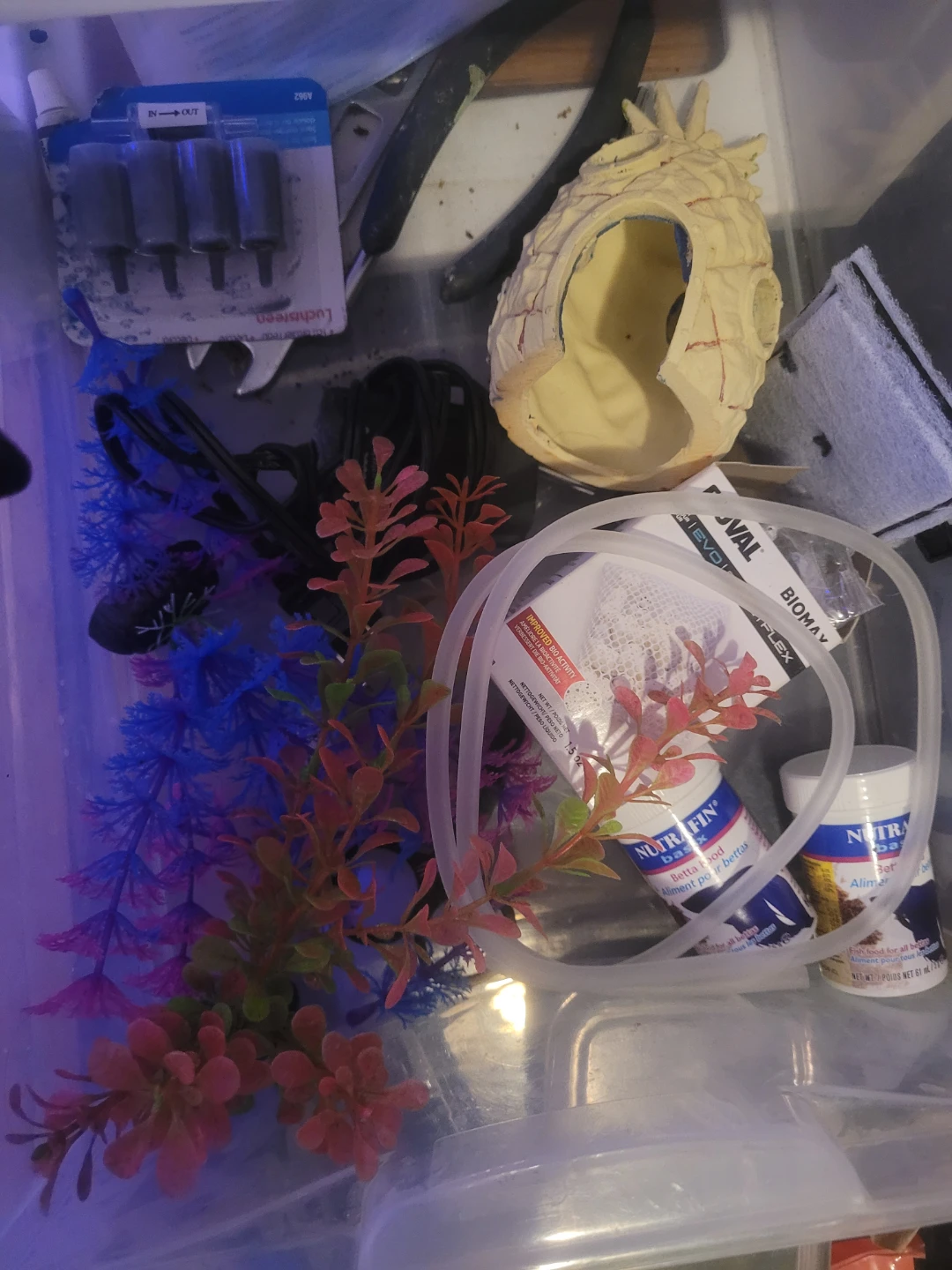 Includes Fluval BioMax filter media, Nutrafin Max fish food, and assorted aquarium decorations like artificial plants and a lava rock volcano. Also comes with an IN/OUT tubing set and a Top Fin filter. Everything needed to set up or maintain a small aquarium environment! Heaters ×2 thermometer LED lighting sponge Bob pineapple !! Glow rocks black light reactive decorations fun!!