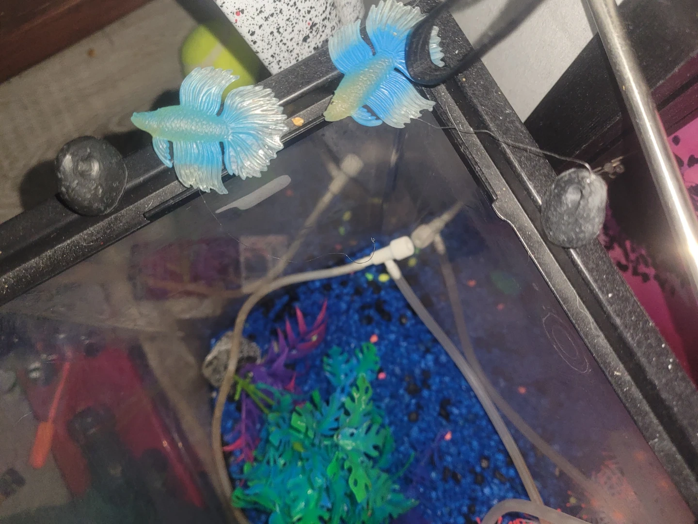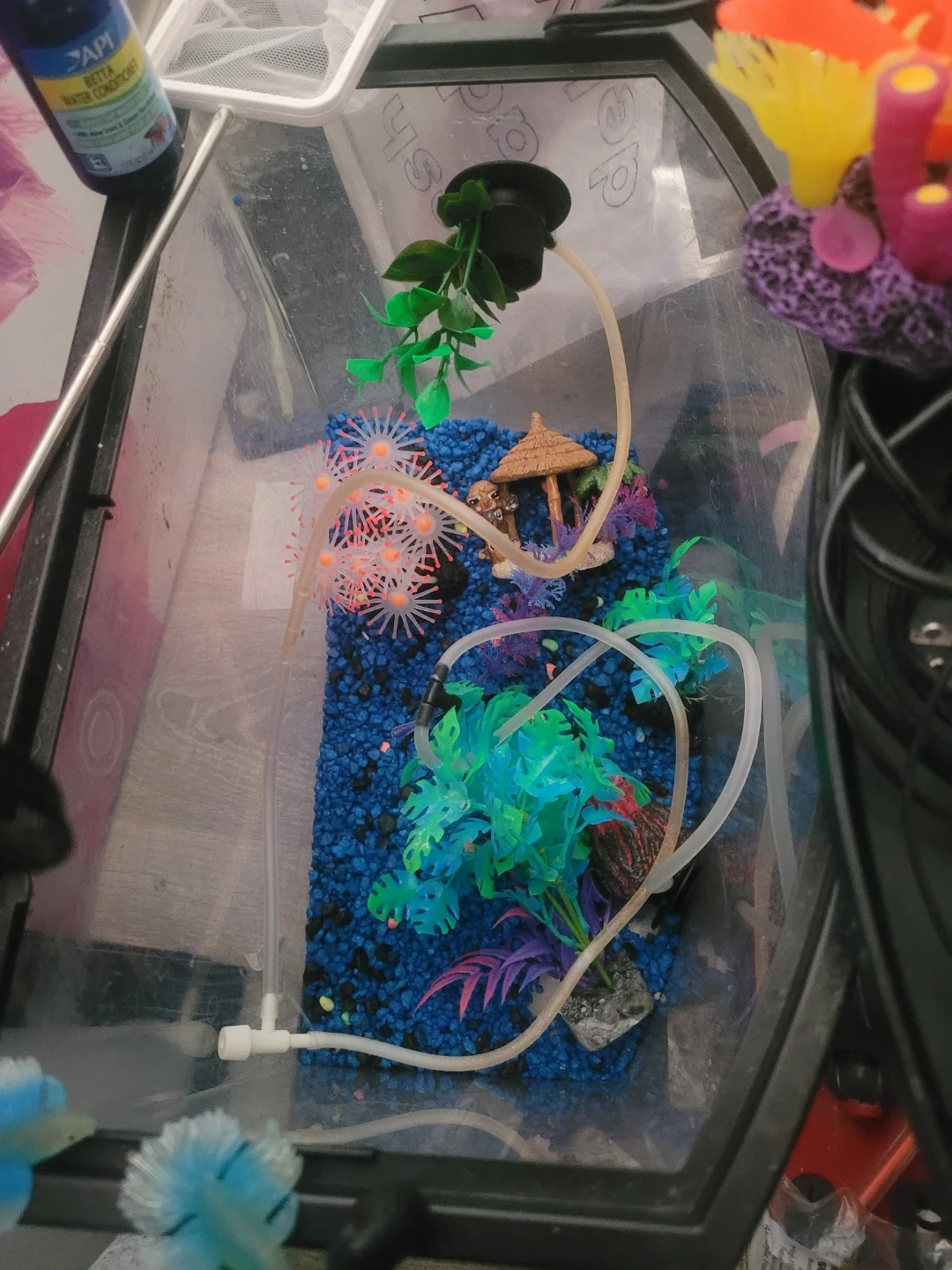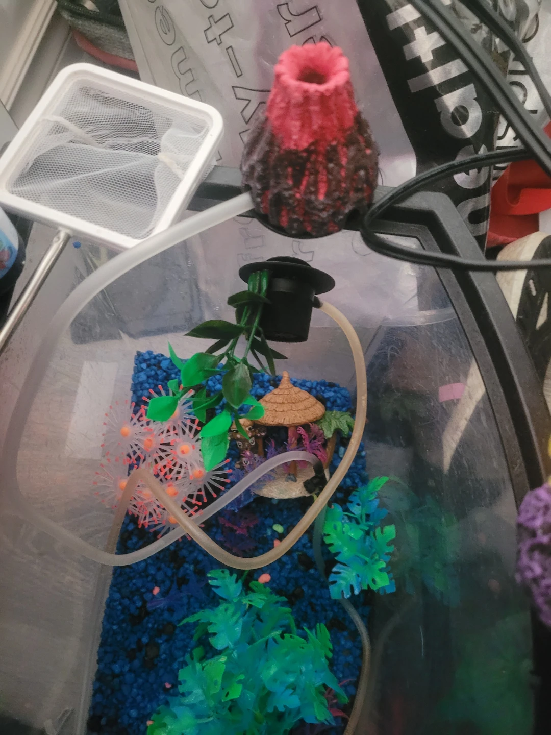 Includes Fluval BioMax filter media, Nutrafin Max fish food, and assorted aquarium decorations like artificial plants and a lava rock volcano. Also comes with an IN/OUT tubing set and a Top Fin filter. Everything needed to set up or maintain a small aquarium environment! Heaters ×2 thermometer LED lighting sponge Bob pineapple !! Glow rocks black light reactive decorations fun!!