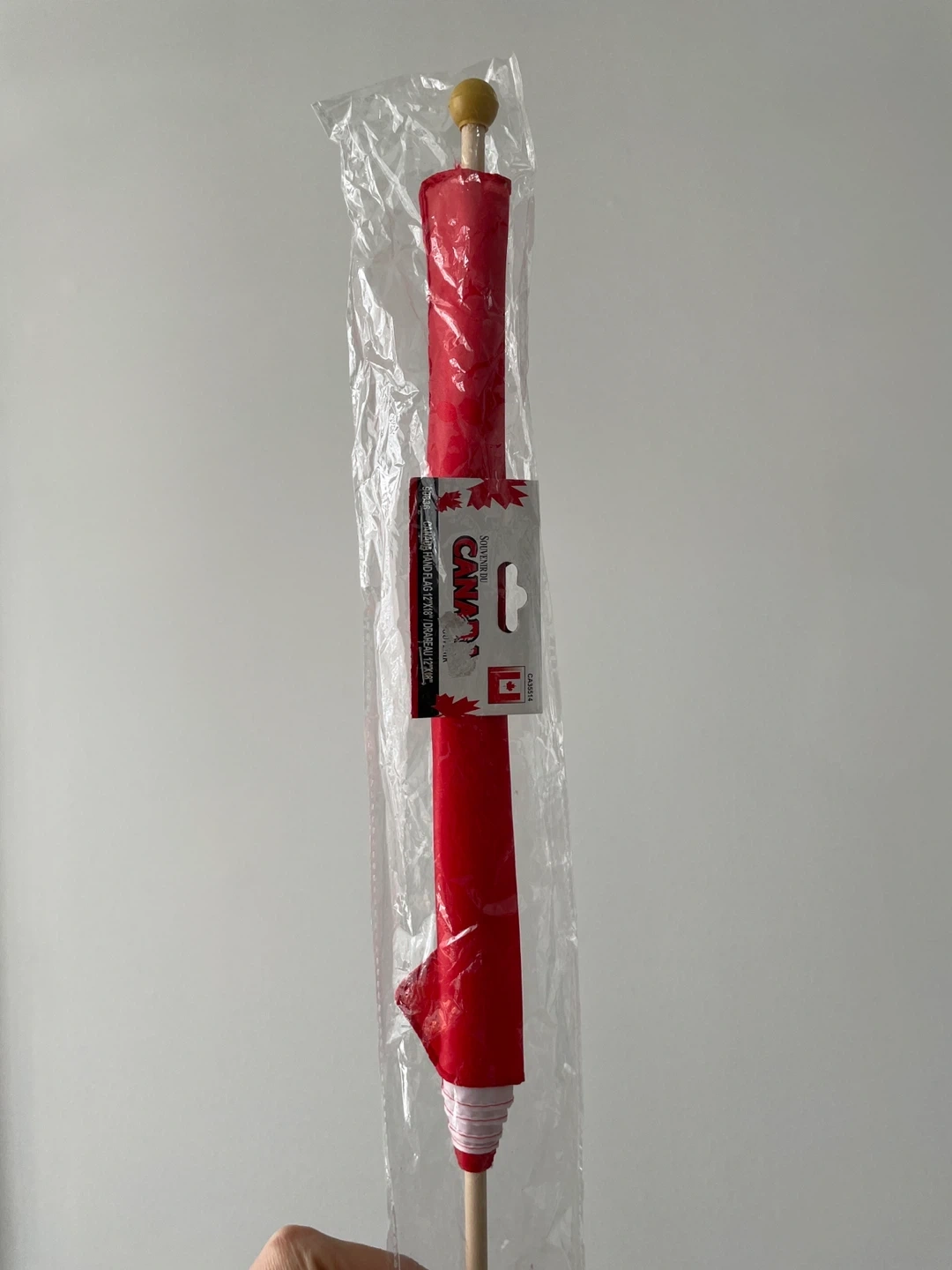 Show your Canadian pride with this handheld flag. It's made of fabric with a wooden stick and a gold ball topper. Perfect for parades, sporting events, or decorating your space!