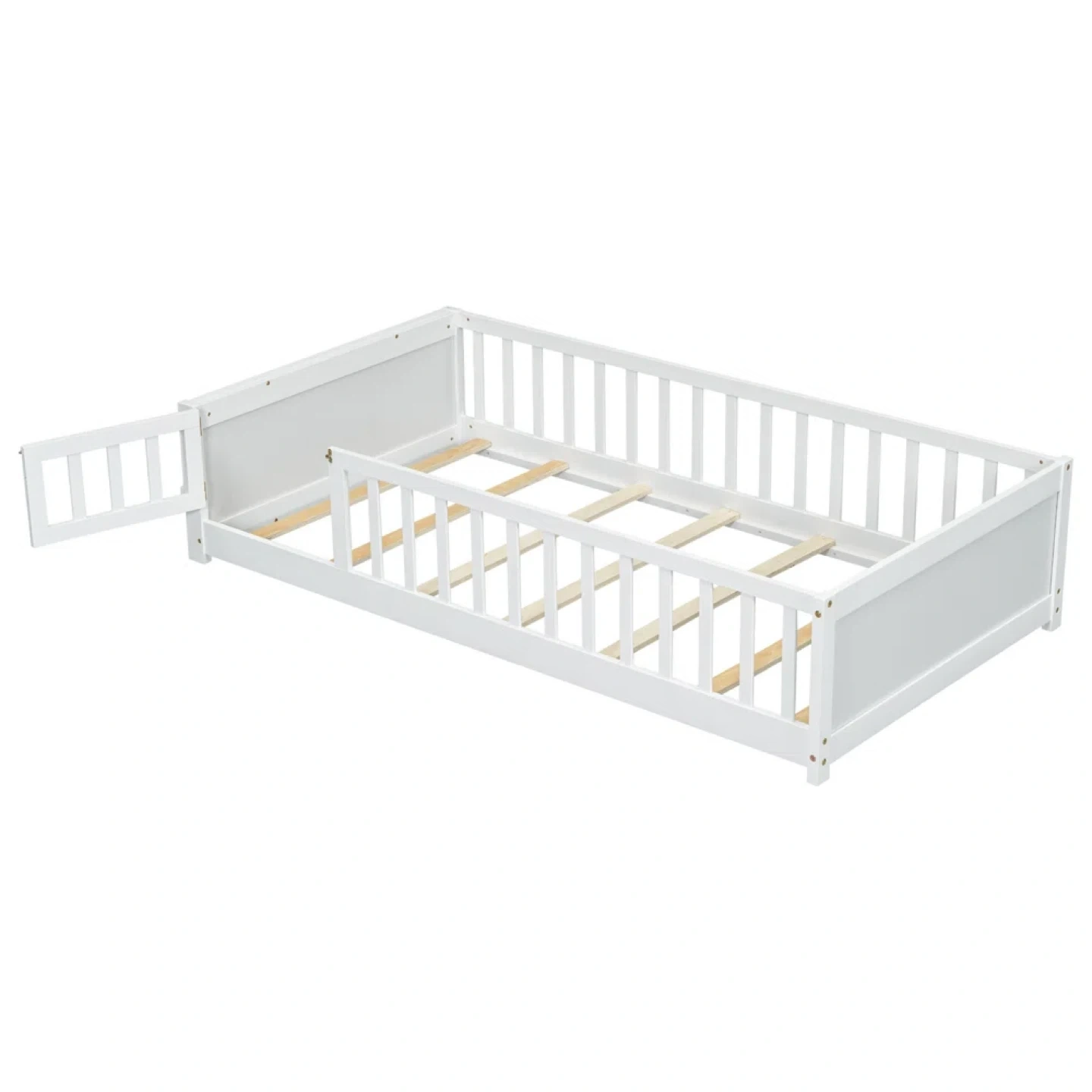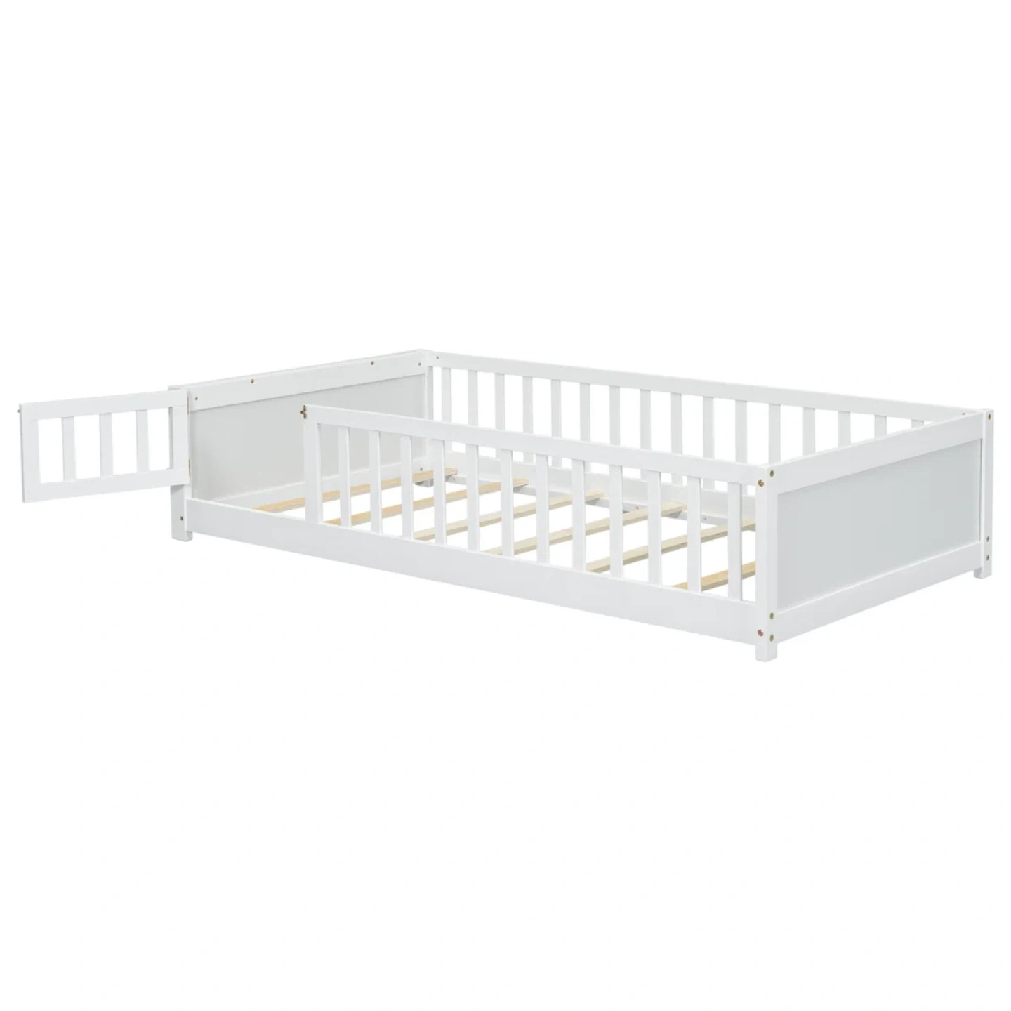 This white toddler bed features sturdy wooden guard rails for safety. It's made of wood and has a slatted base. Perfect for transitioning your little one to a bigger bed!