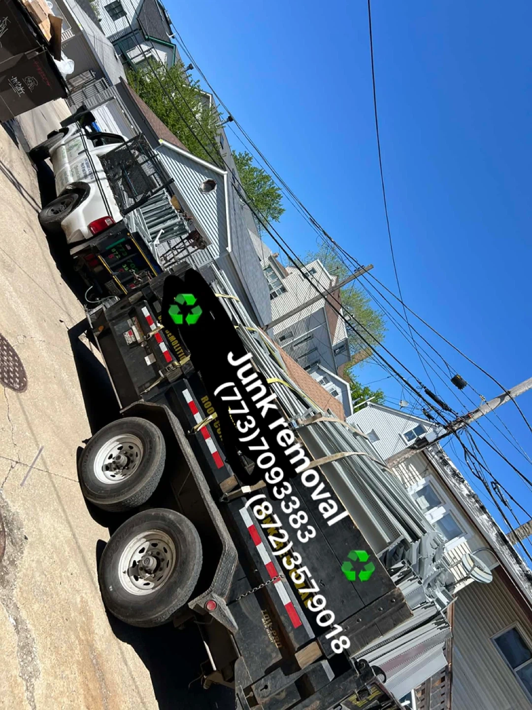 Dump trailer for junk removal services. Features prominent branding and contact information for easy booking. It's ready for your next project!