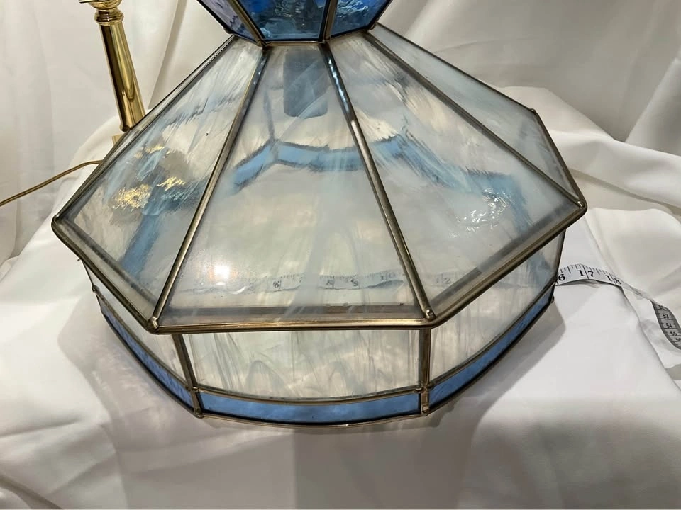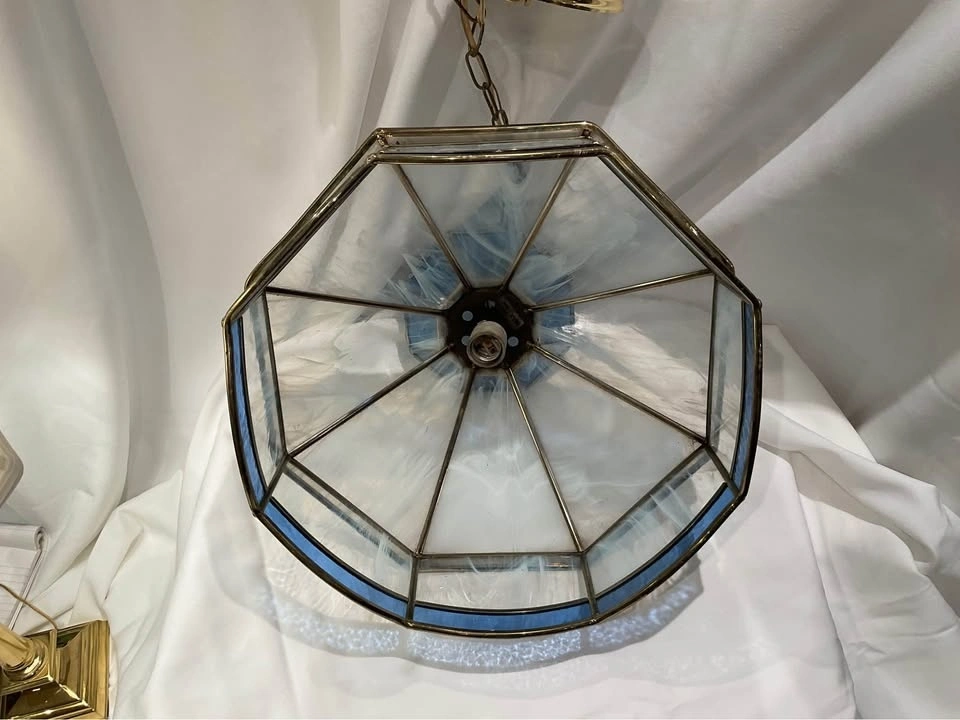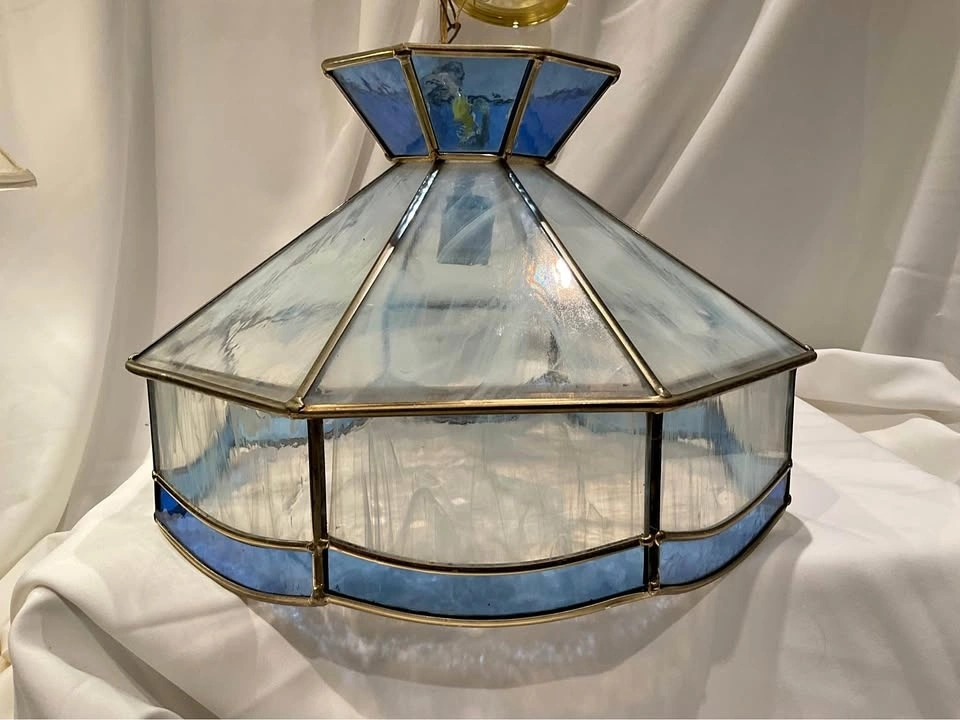 Tiffany Style Light Fixture Featuring Blue and Milk Glass Stained Glass In A Brass Frame. 16 inches Width, Height 13 inches. Good Condition. Smoke & Pet Free Home. #398/1200. Located in Richmond Hill, Bathurst & King Rd.