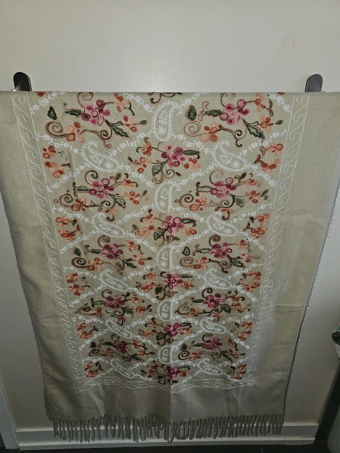 A beige Cashmere scarf featuring intricate floral embroidery and a delicate fringe. This stylish accessory adds a touch of elegance to any outfit. The soft fabric is comfortable for year-round wear.
