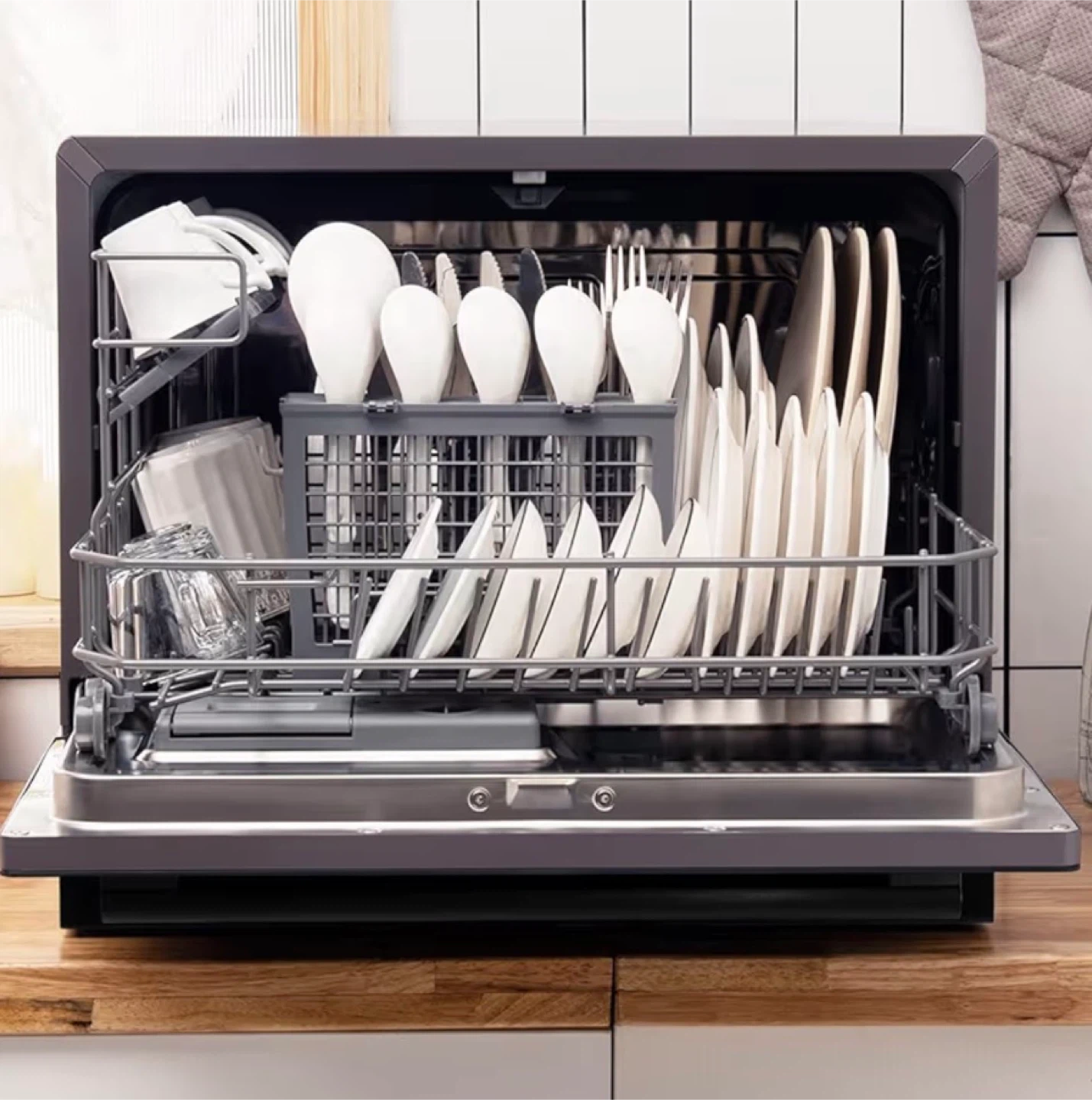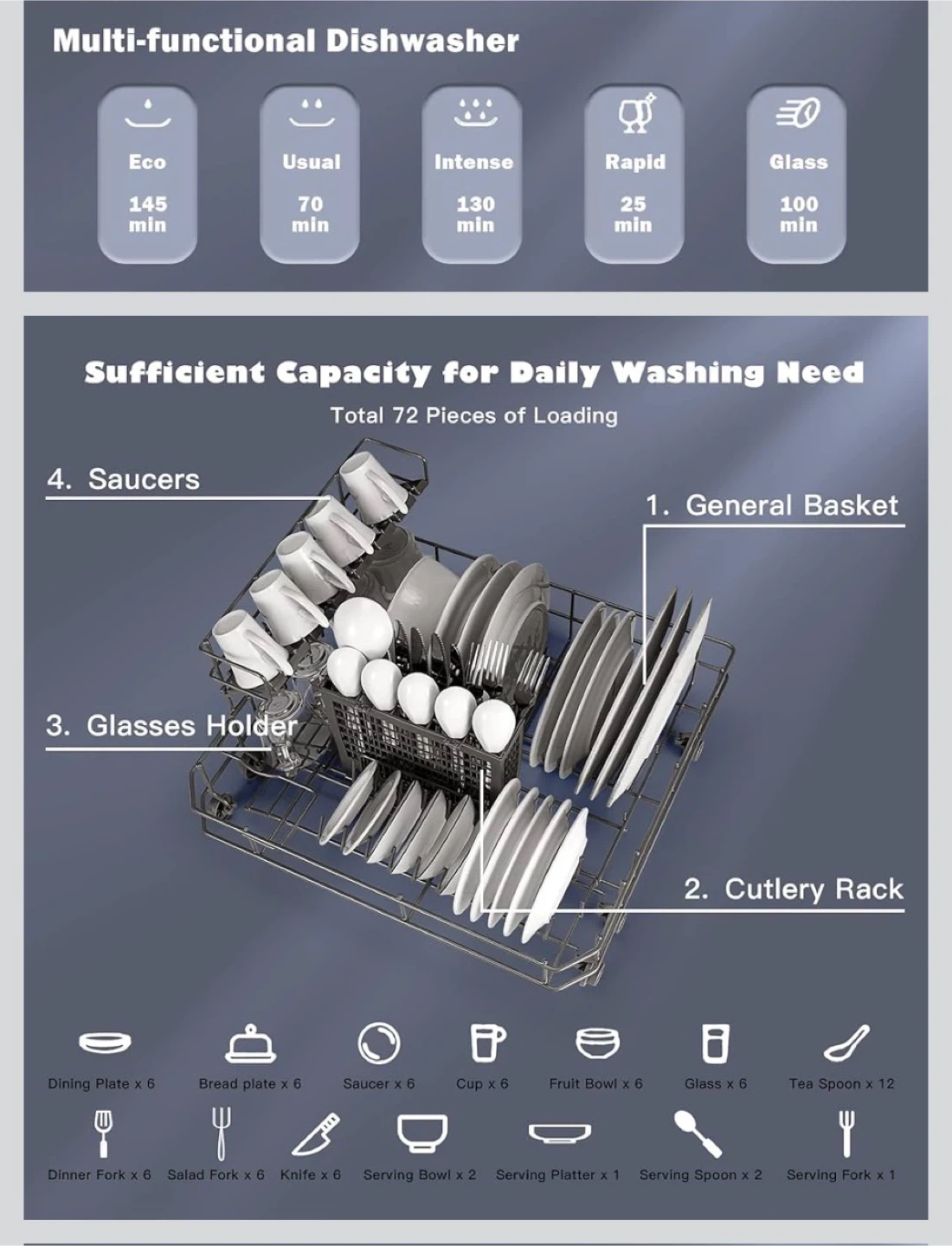 Selling a COSTWAY countertop dishwasher in excellent condition! It's a multi-functional dishwasher with several wash programs, including Eco, Usual, Intense, Rapid, and Glass settings. It has a sufficient capacity for daily washing needs, holding a total of 72 pieces.