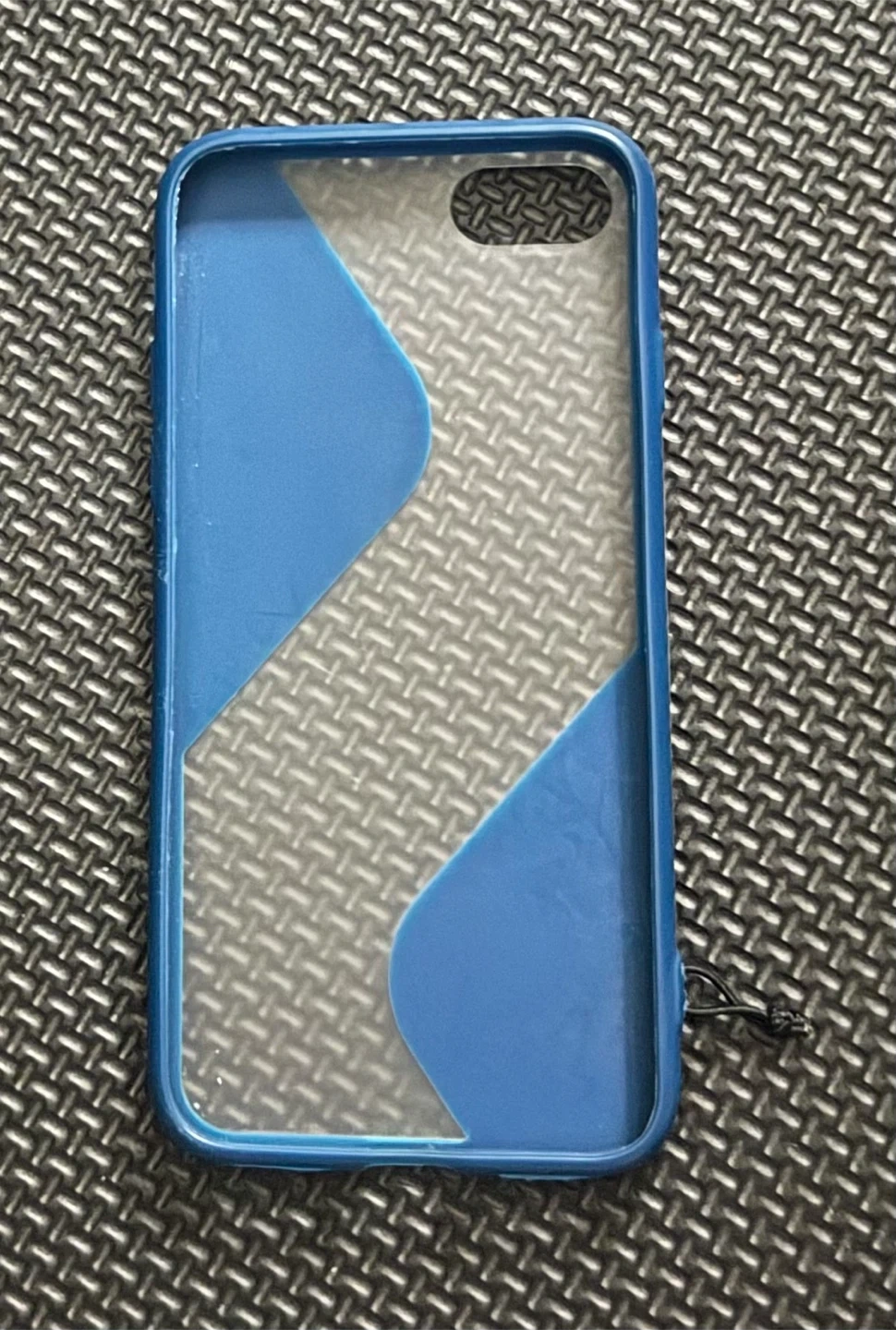 This is a blue and clear phone case. It's made of a flexible plastic material. The case has a textured clear back with blue accents. It includes a small lanyard loop.
