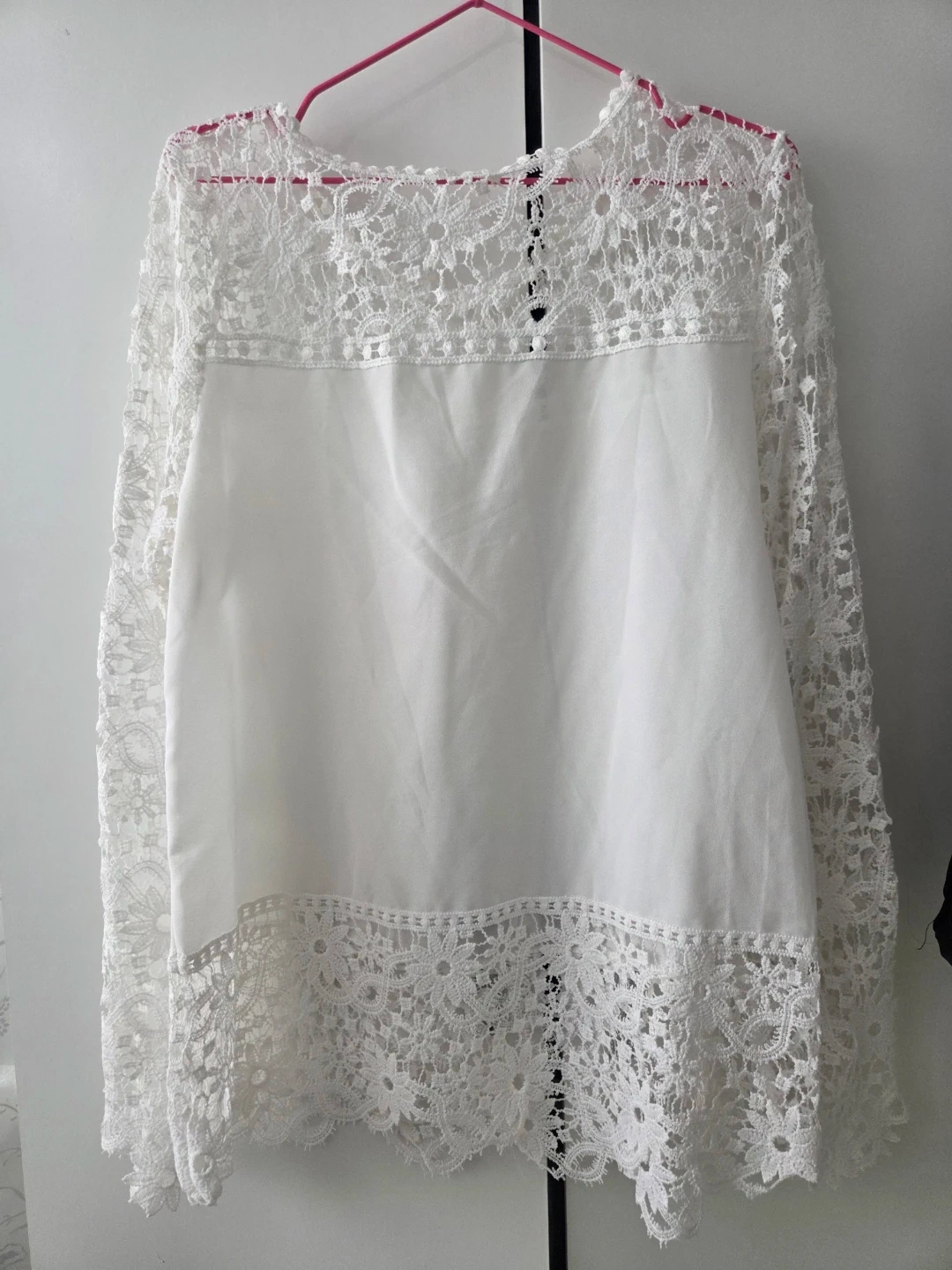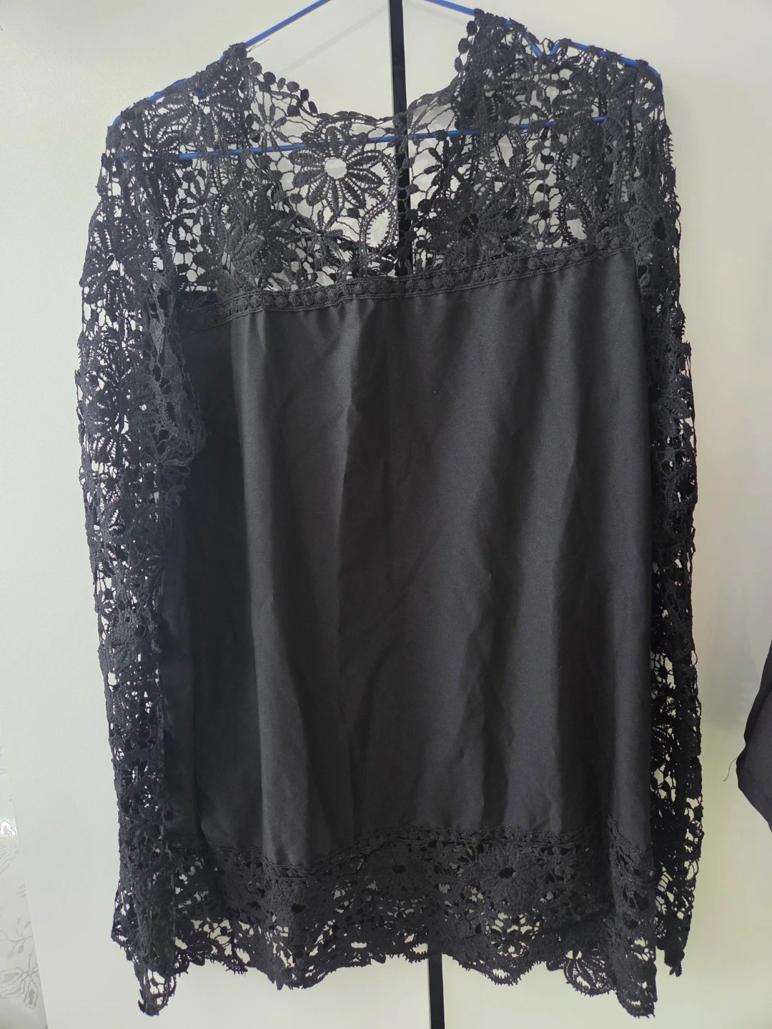 This black blouse features beautiful all-over lace detailing on the sleeves and hem. It's a stylish piece perfect for dressing up an outfit. The fabric appears to be a lightweight polyester blend.