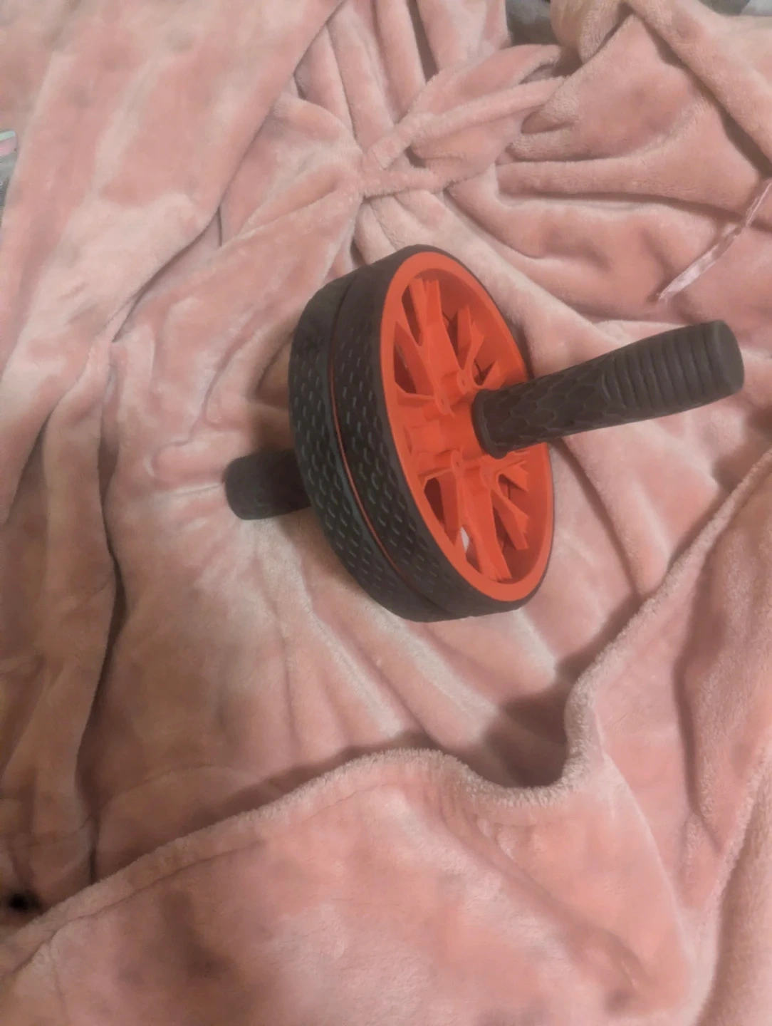 This ab roller wheel features a durable black tire tread for grip and orange plastic spokes. It comes with comfortable black handles.