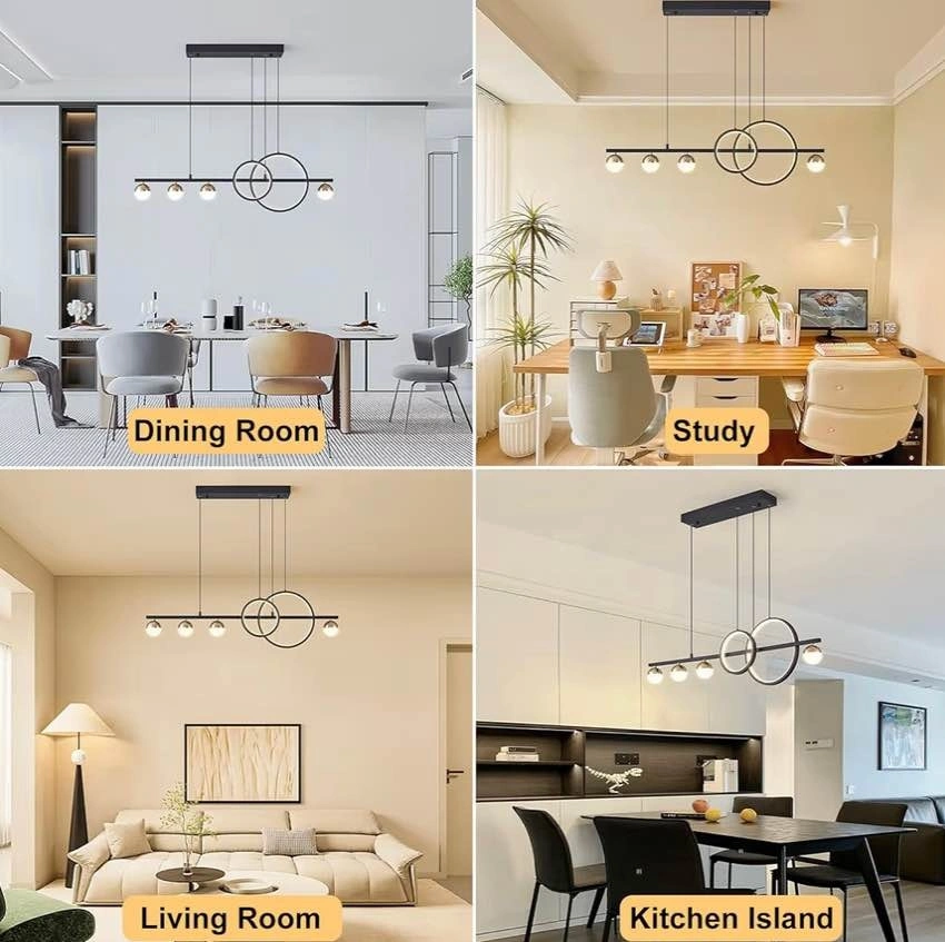 Elegant and stylish modern black and gold linear LED chandelier, perfect for dining rooms, kitchen islands, and modern homes. Brand new in box, unused and in original factory packaging.