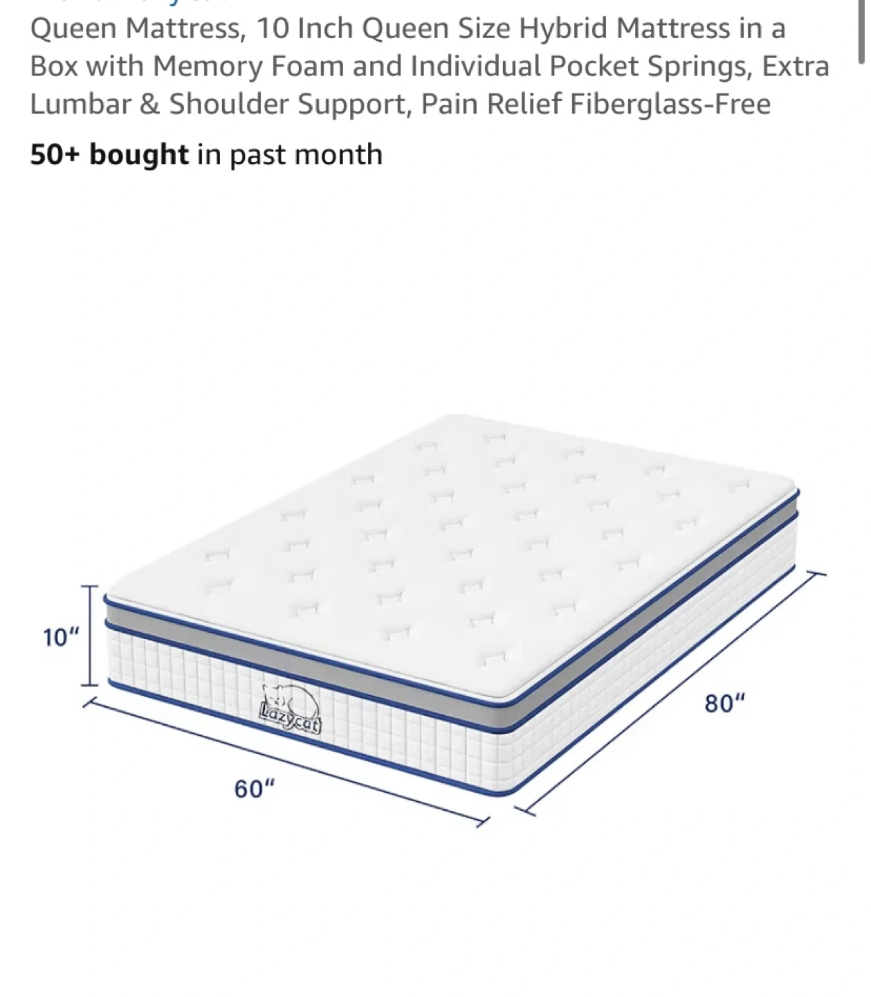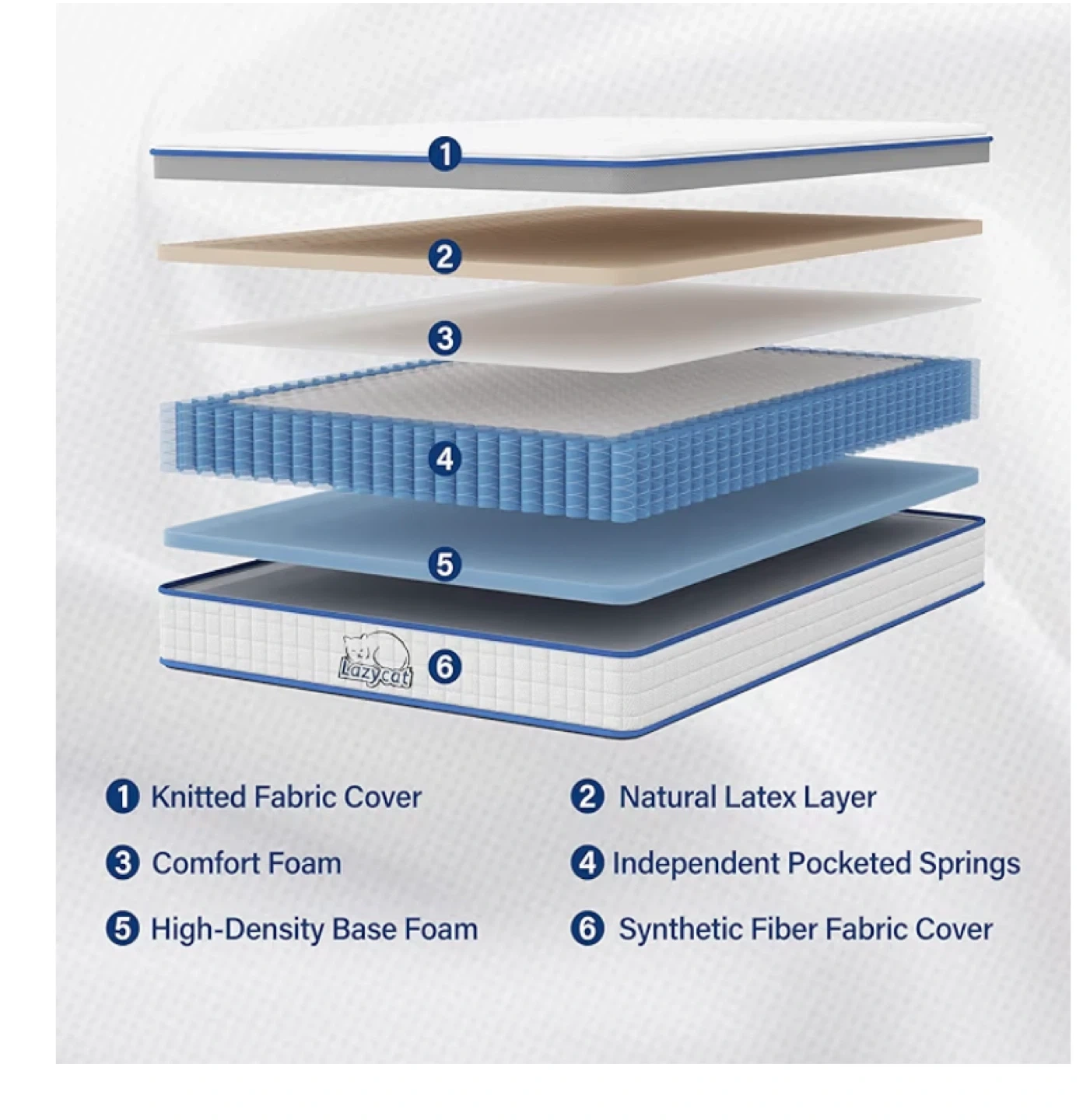 This Lazy Cat Queen mattress is 10 inches thick. It's a hybrid model with memory foam and individual pocket springs for support. The knitted fabric cover offers comfort. It's been bought in a box for convenience.
