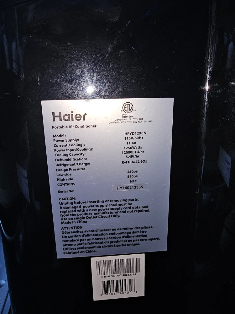 Selling a Haier portable air conditioner. It's black and shows some signs of use, with some scratches on the exterior. Still works great for cooling down a room though