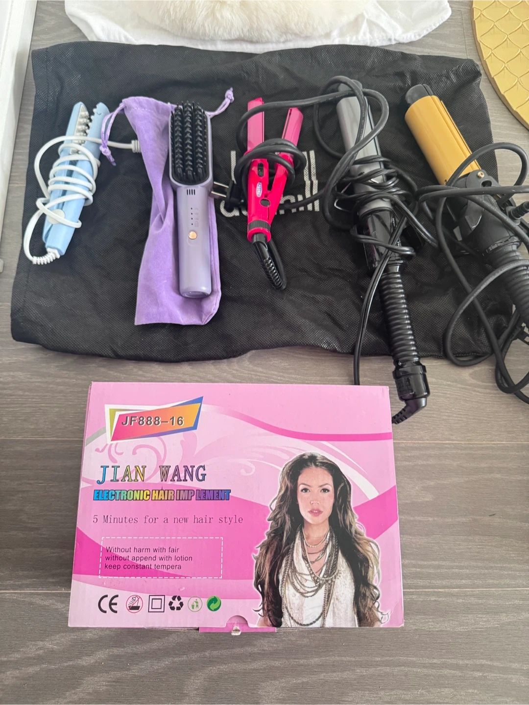 Selling multiple hair styling tools including curling irons, a hair straightener, electric curling rollers and etc. Great for creating a variety of hairstyles!