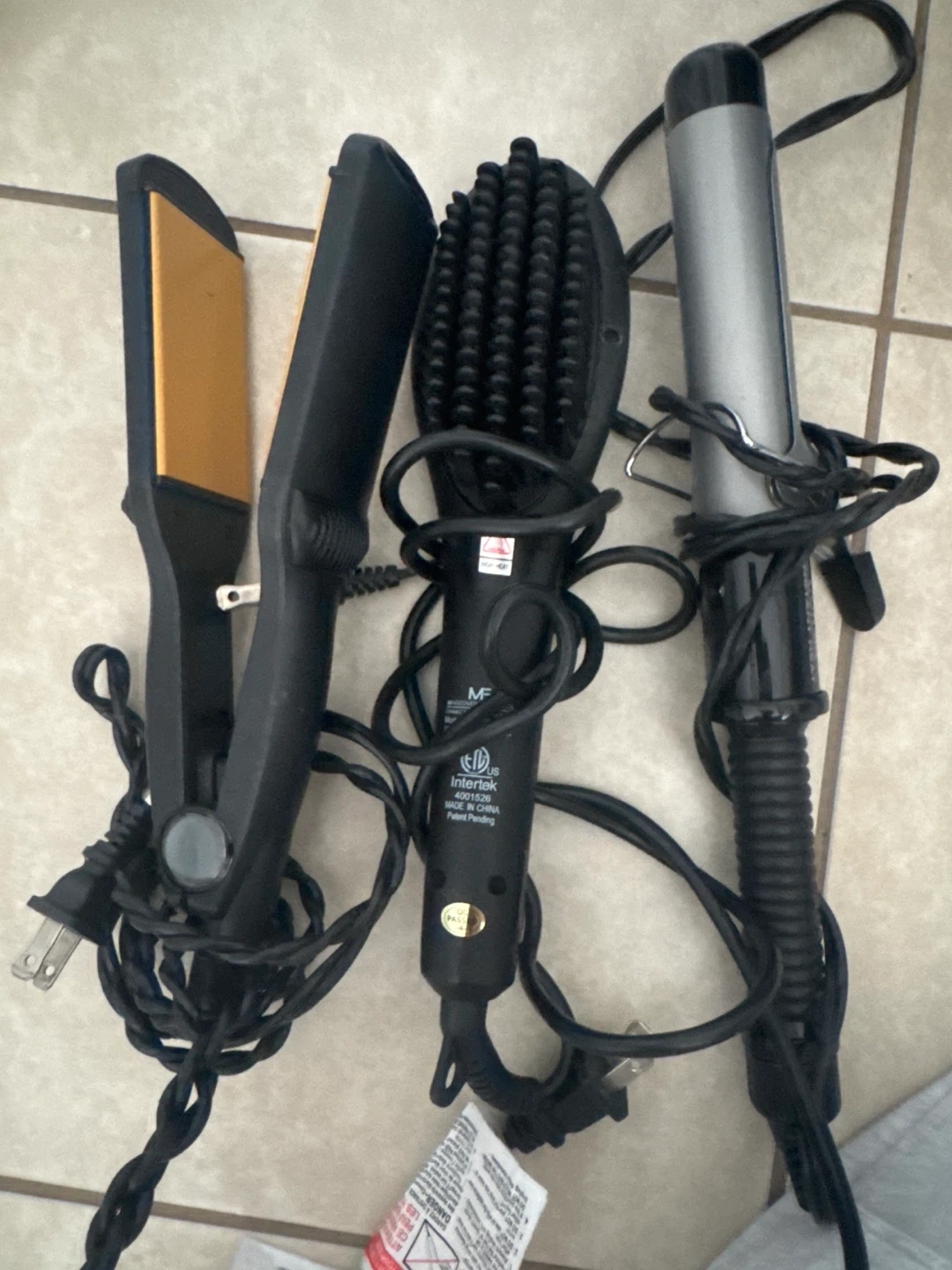 Selling a few hair styling tools! There's a flat iron with gold plates, a curling iron by Conair, and a hair straightening brush. All in good working condition.