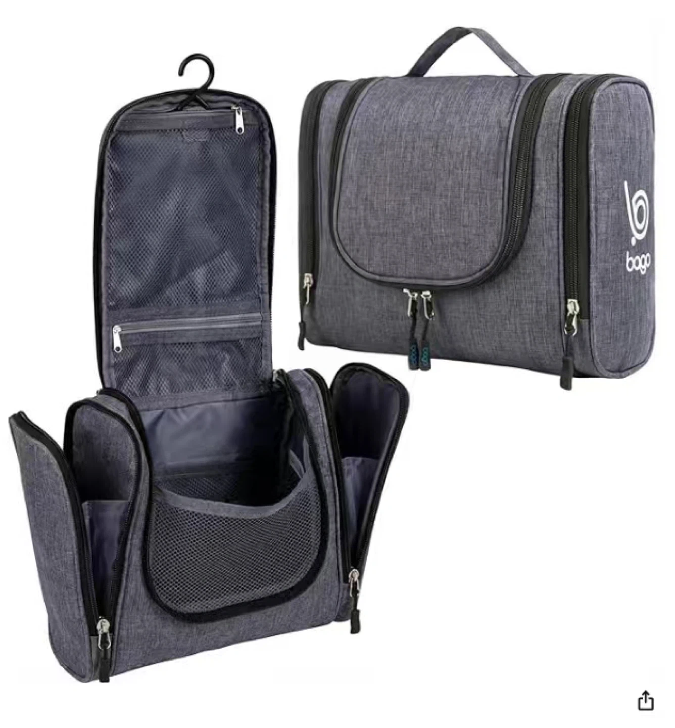 This Bago toiletry bag is grey and made of durable, waterproof fabric. It features multiple compartments including stow-away hook, see-through mesh pockets, and zippered inner compartments for organized storage. It's perfect for travel to keep your essentials protected from spills and stains.