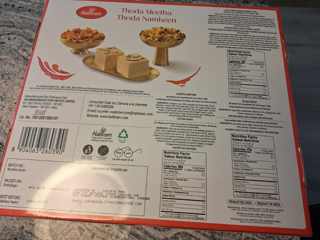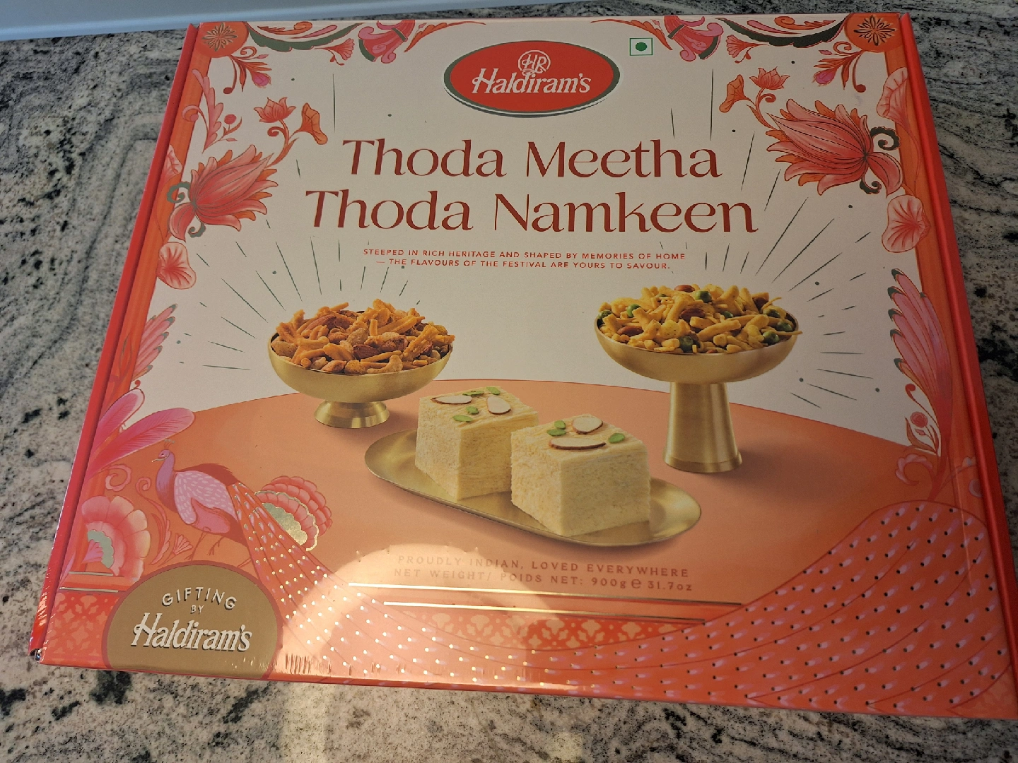 121Selling a box of Haldirm's Thoda Meetha Thoda Namkeen, a mix of Indian snacks! It contains a variety of sweet and savory treats. The best before date is 2026 July 10