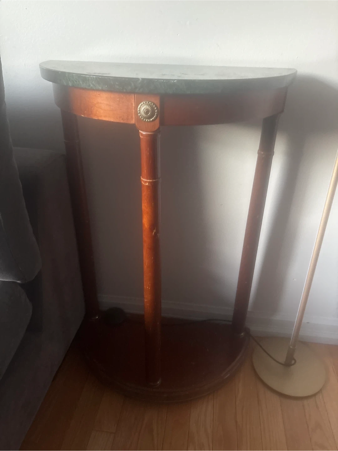 Selling a lovely half-moon accent table. It features a beautiful marble top and a sturdy wooden base. It's perfect for adding a touch of elegance to any room in your home! Open to reasonable offers No holds First come first serve. Pick up only. Cash only
