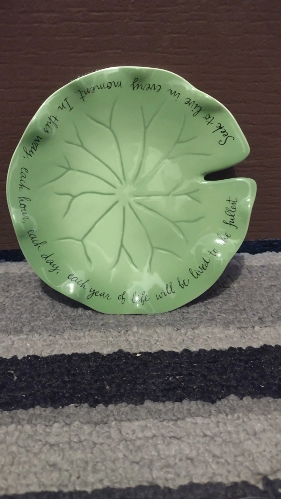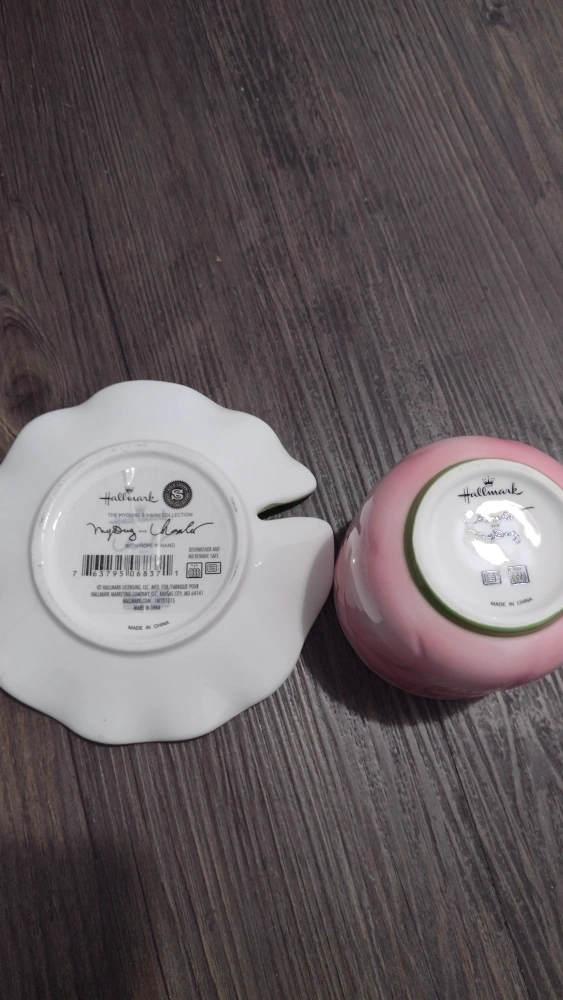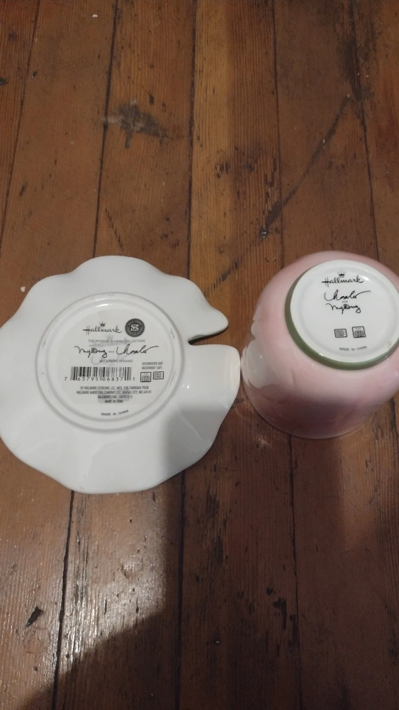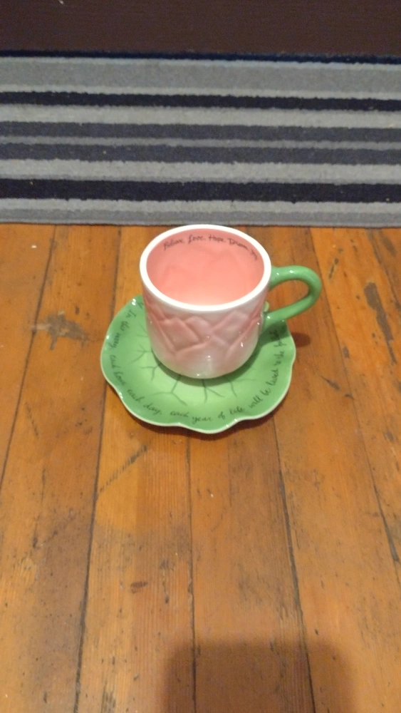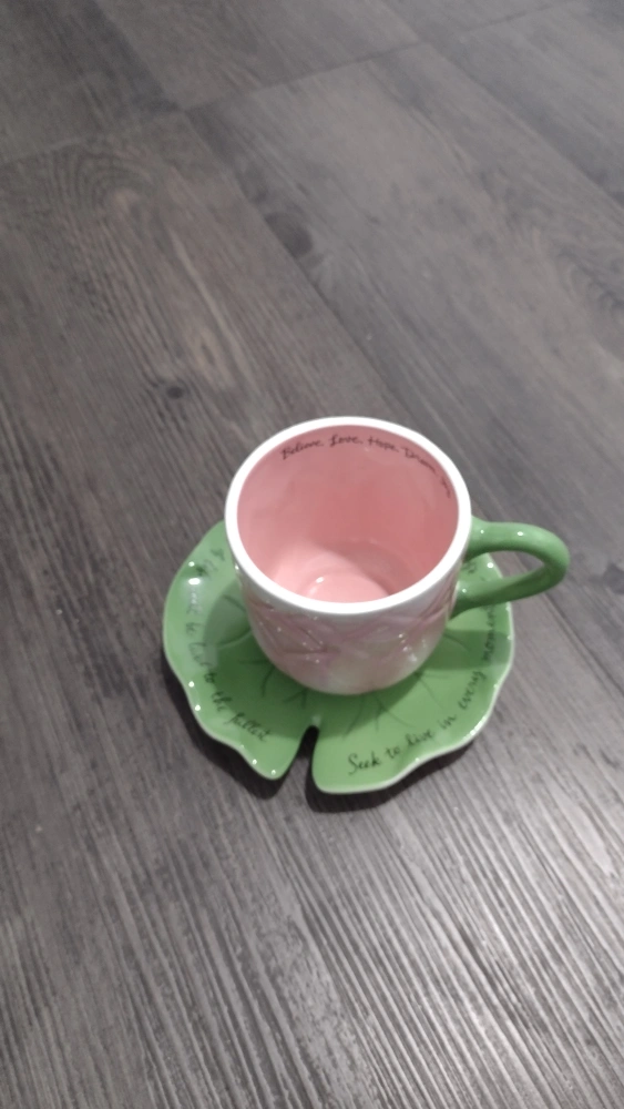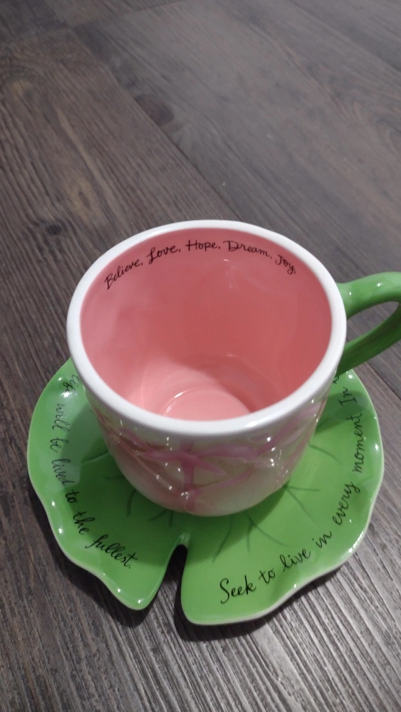Selling a cute Hallmark Charlie Mystery cup and saucer set! The saucer is a lovely green and shaped like a lily pad, with the saying "Seek to live in every moment. In this way, each hour, each day, each year of life will be lived to the fullest" written around the edge. The cup is a pretty pink colour with a green handle. Perfect for adding a touch of whimsy to your tea time!