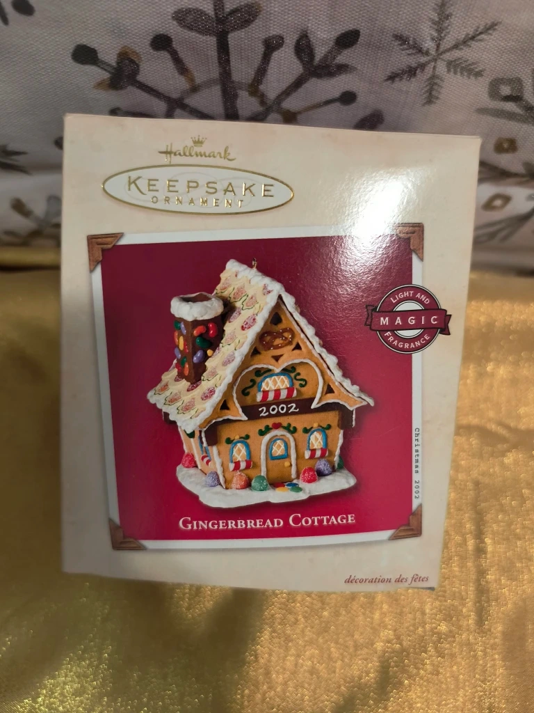 29Selling a Hallmark Keepsake Ornament, the Gingerbread Cottage from 2002! It's a unique ornament designed to add both light and a delightful whiff of fragrance to your tree. This magic ornament uses one standard, replaceable fragrance insert for air freshener. Two inserts are provided. The box is included