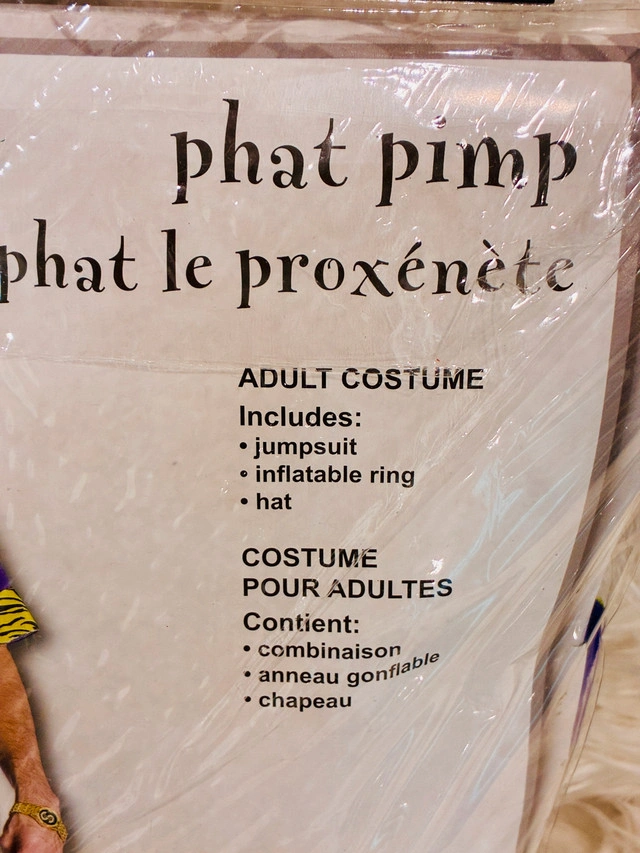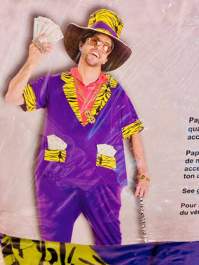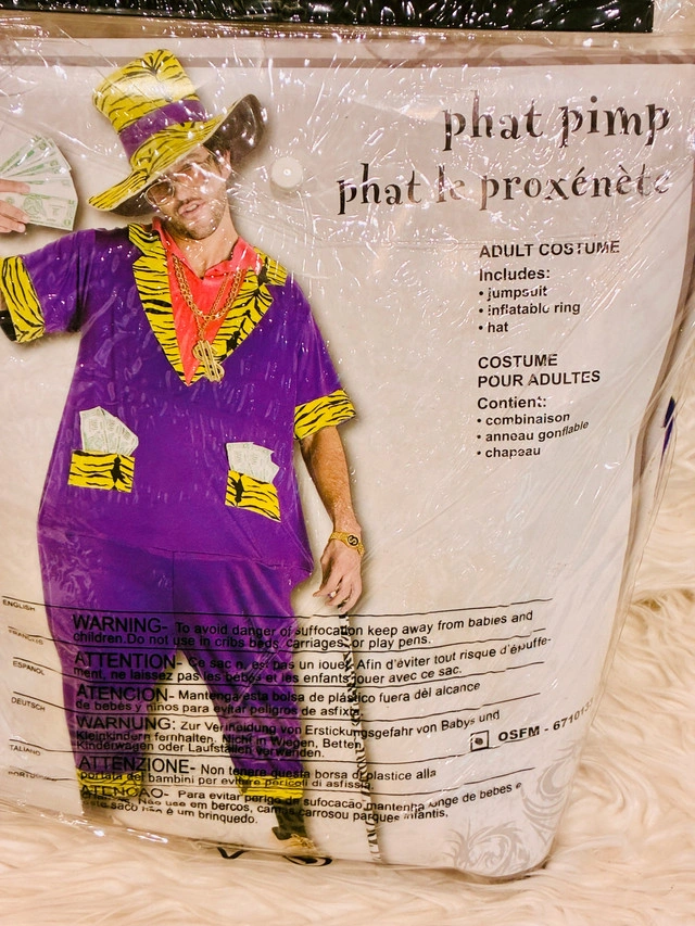 Check out this Phat Pimp costume, perfect for Halloween, featuring a purple suit with neon yellow and black tiger-stripe accents, a matching top hat, and dollar-sign accessories. It's in the package, never been tried on by the seller, and ready to bring the swagger to your next party! Large size. Note that there more costumes available! Fixed price. For Sale By: Owner