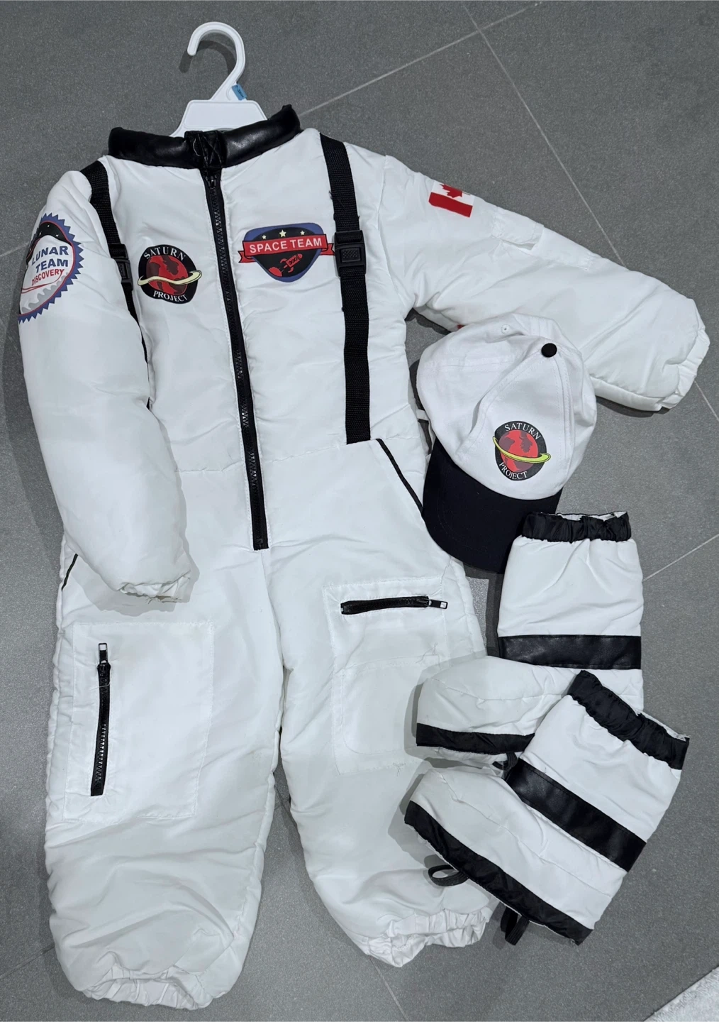 60Get ready for lift-off with this adorable astronaut costume! It's size M (5-6), which fits kids around that age range. The costume includes the jumpsuit, a cap, and boot covers to complete the look. Perfect for dress-up, Halloween, or just some out-of-this-world fun!