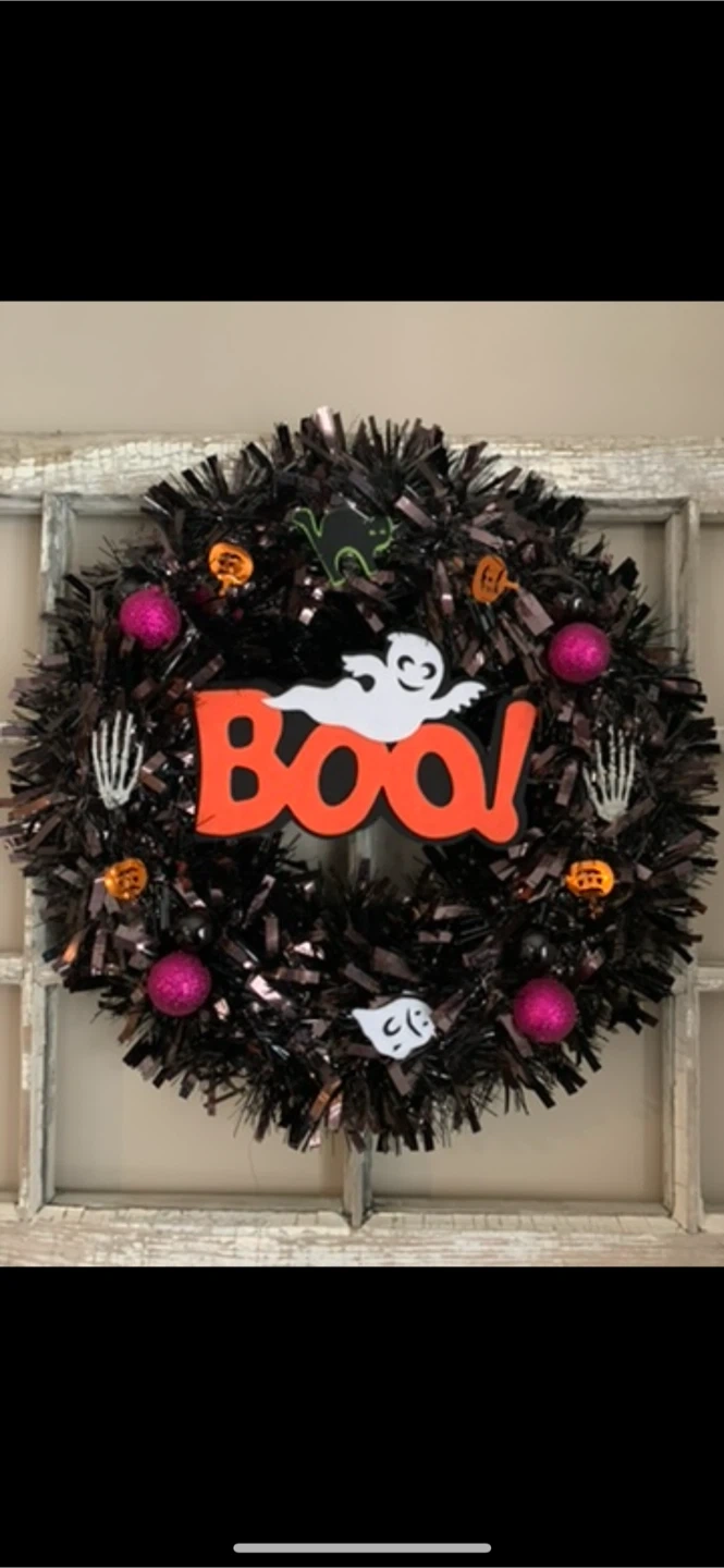 Get ready for spooky season with this fun Halloween wreath! It features a 'Boo' sign, glittery tinsel, and cute Halloween-themed decorations like ghosts, pumpkins, and skeletons. Perfect for adding a festive touch to your front door or any room in your home $20