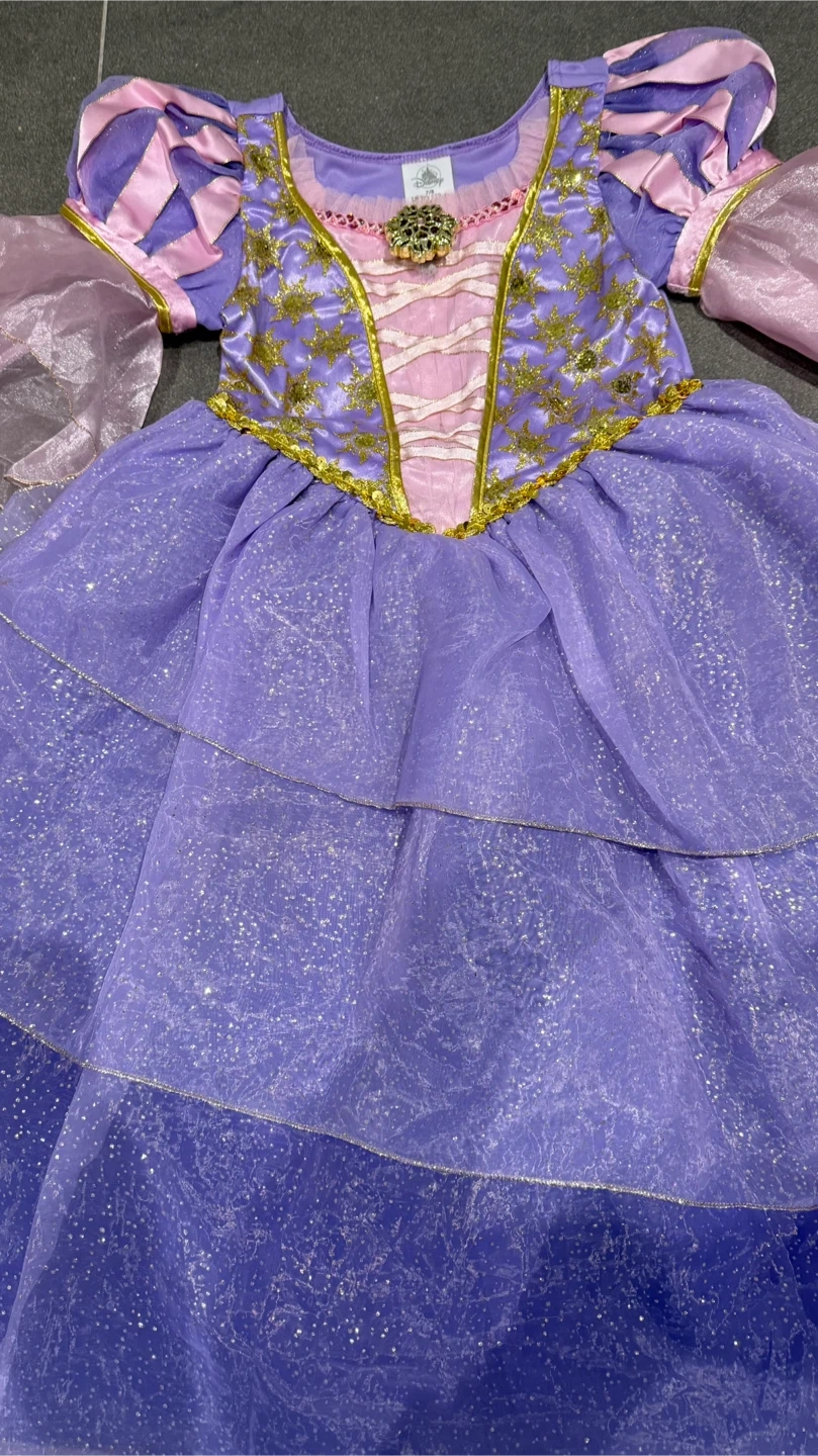60A beautiful Rapunzel dress from Disney! This dress is a size 7/8 and is perfect for any little princess who loves Tangled. It features lovely details like gold accents and a layered skirt. It's in great condition and ready for a new home!