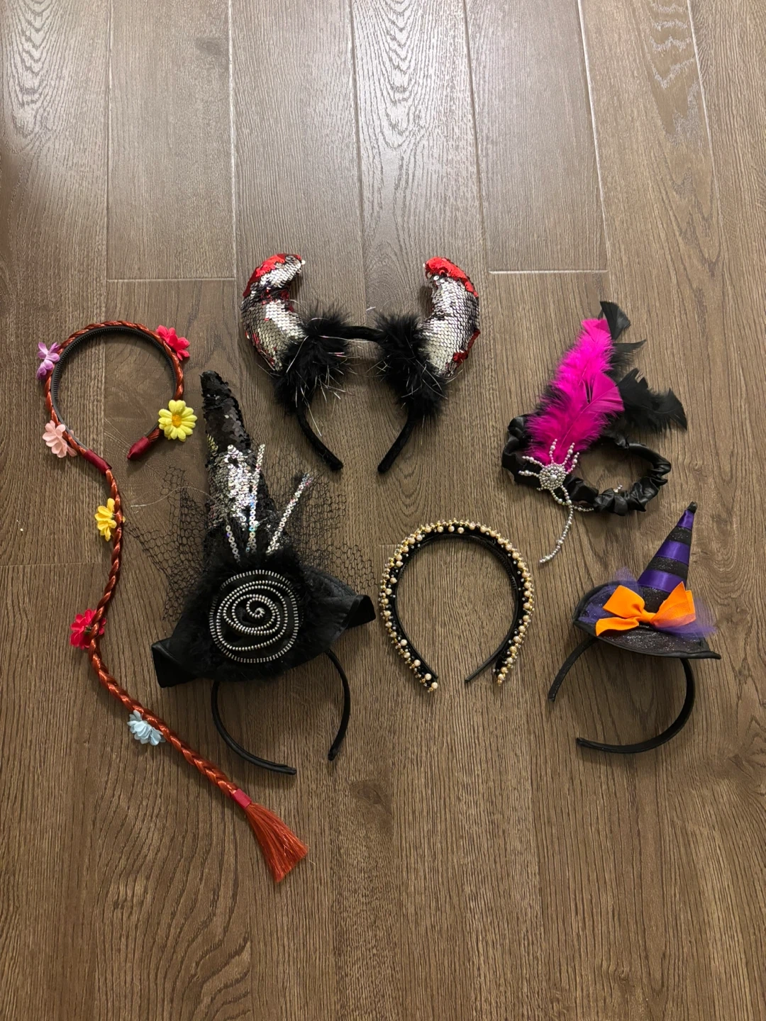 140Getting ready for Halloween? I have a selection of fun costume headbands! There's a devil horn headband, several witch hat headbands, and other festive designs. Perfect for adding a bit of spooky flair to your outfit!