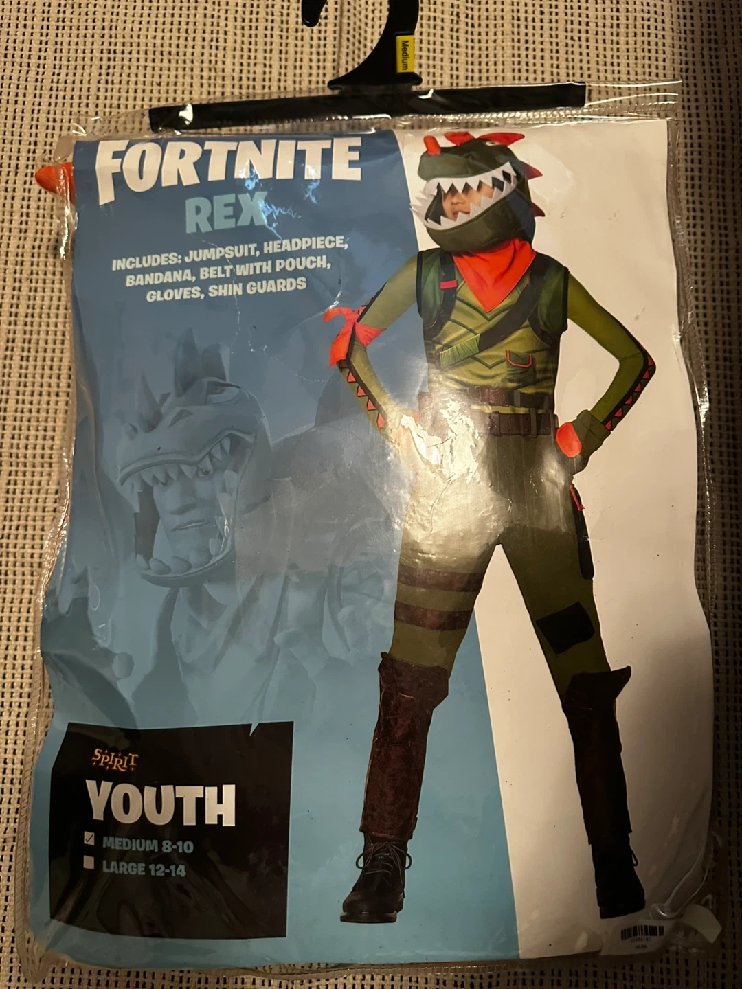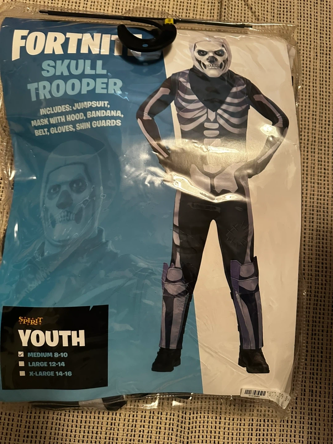 10Ninja turtle size 8–10 Fortnite Skull Trooper costume for youth. It includes the jumpsuit, mask with hood, bandana, belt, gloves, and shin guards. Size is Medium (8-10). Ninja size 8–10 full costume included Fortnite Rex size 8–10 full costume included Fortnite skeleton size 8–10 full costume included Baby gladiator 12 months full costume include Scooby Doo dog size 2-3 full costume included Scooby Doo shaggy size 2-3 full costume Paw patrol size 2-3 full costume included