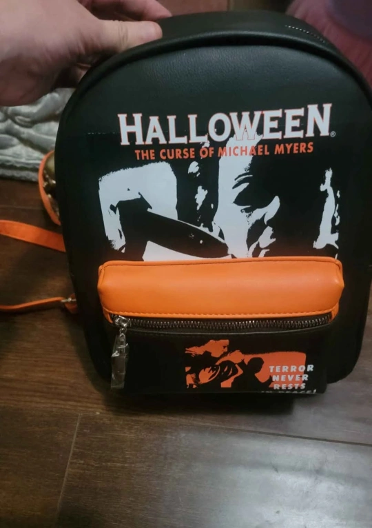 Selling a Halloween: The Curse of Michael Myers backpack! It features a design from the movie and has an orange accent pocket. Perfect for any horror fan!