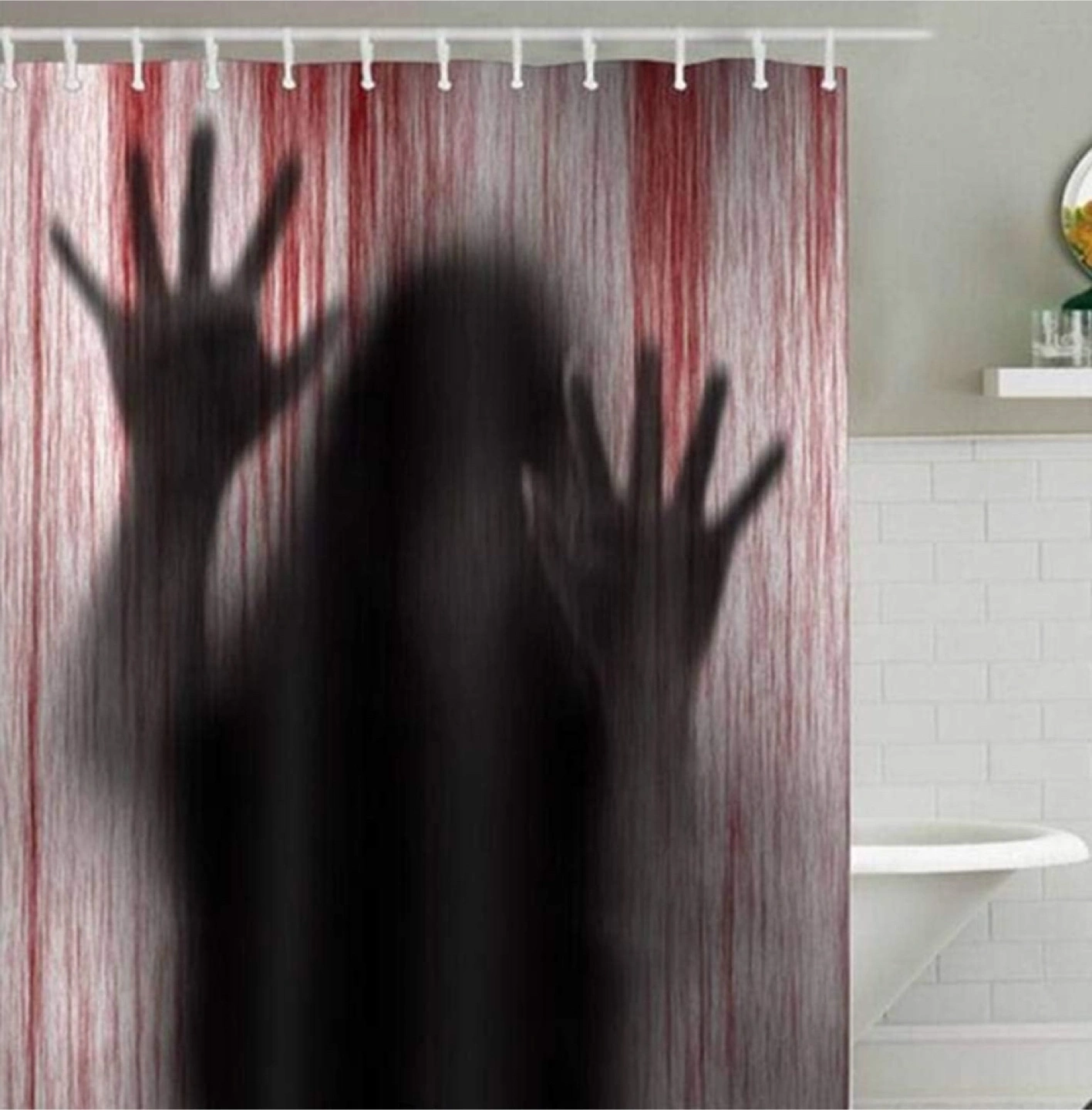 91Just posted n time for Halloween !! with this themed shower curtain. Features a bloody background with a shadowy figure. Adds a creepy atmosphere to your bathroom.