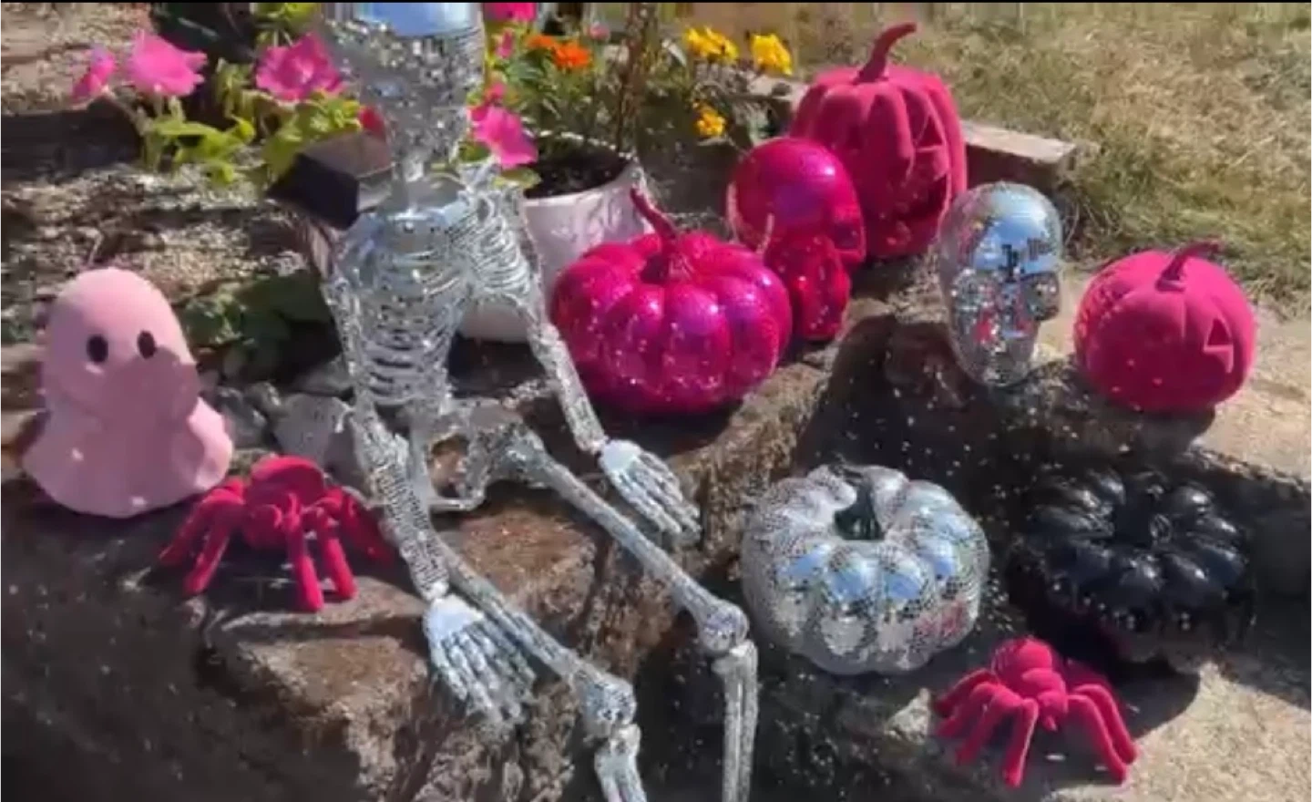3ft skeleton SOLD Silver skull $40 Pink skull $40 Silver pumpkin $40 Pink pumpkin $40 Black pumpkin $40 Dark pink flocked ghost $25 Light pink flocked ghost $25 Dark pink flocked spider $20 Light pink flocked spider $20