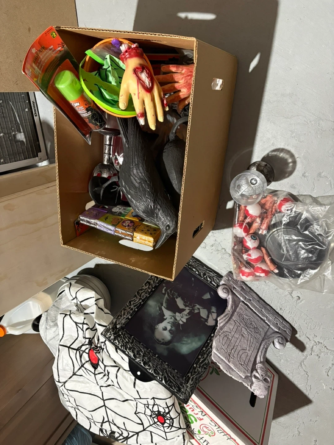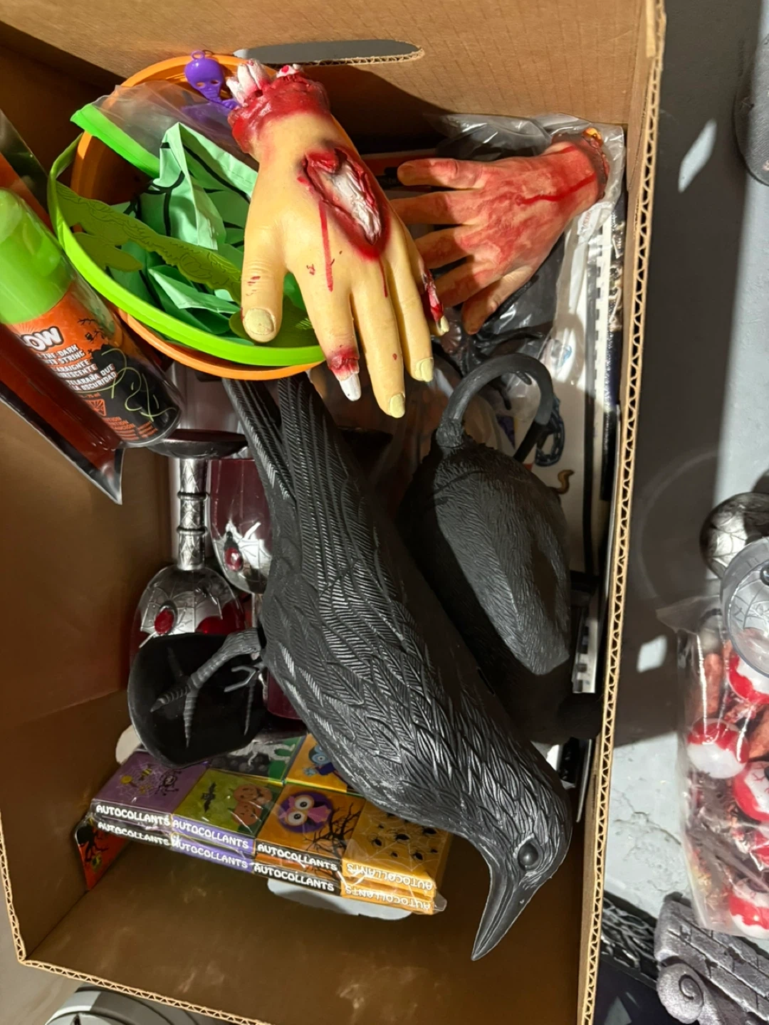 65Selling a box of Halloween decorations. Includes various items such as fake hands, a black crow, spiderwebs, and other spooky decor. Perfect for getting your house ready for Halloween!