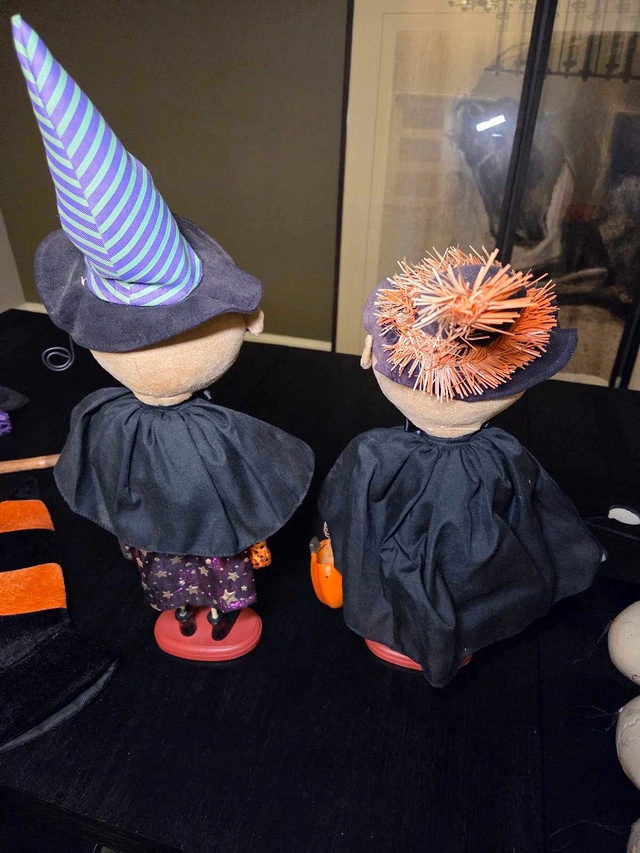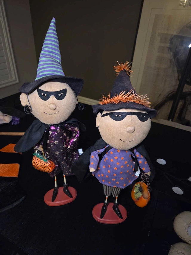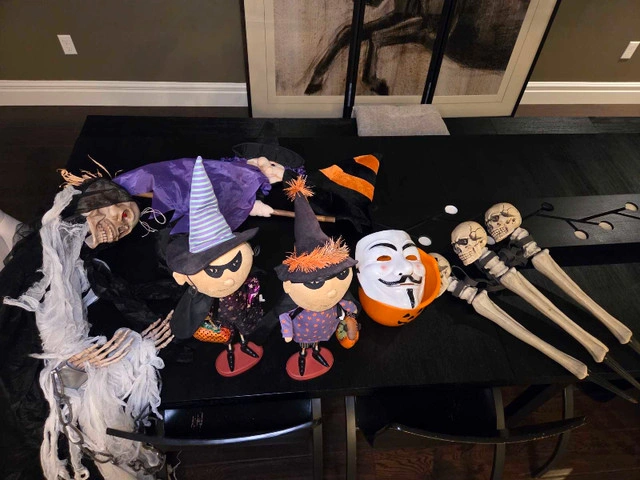 Get ready to spookify your home with this mixed lot of Halloween decorations! This selection includes a hanging grim reaper, a posable witch, skeleton stakes, and cute decorative witch figures. These used decorations will add a playful yet eerie touch to your Halloween setup. Perfect for creating a fun and festive atmosphere! While my spooky decorations are eager to haunt your house, remember, if the ad is up, they're still waiting to be adopted! All for $150 or individually Grim reaper $45 (it can light up if you change the battery) Witch on a broom $15 Skeleton stakes $15 (it can light up if you change the battery) 2 witch figures $80 Halloween bucket $10 Mask $10 Witch hat $5