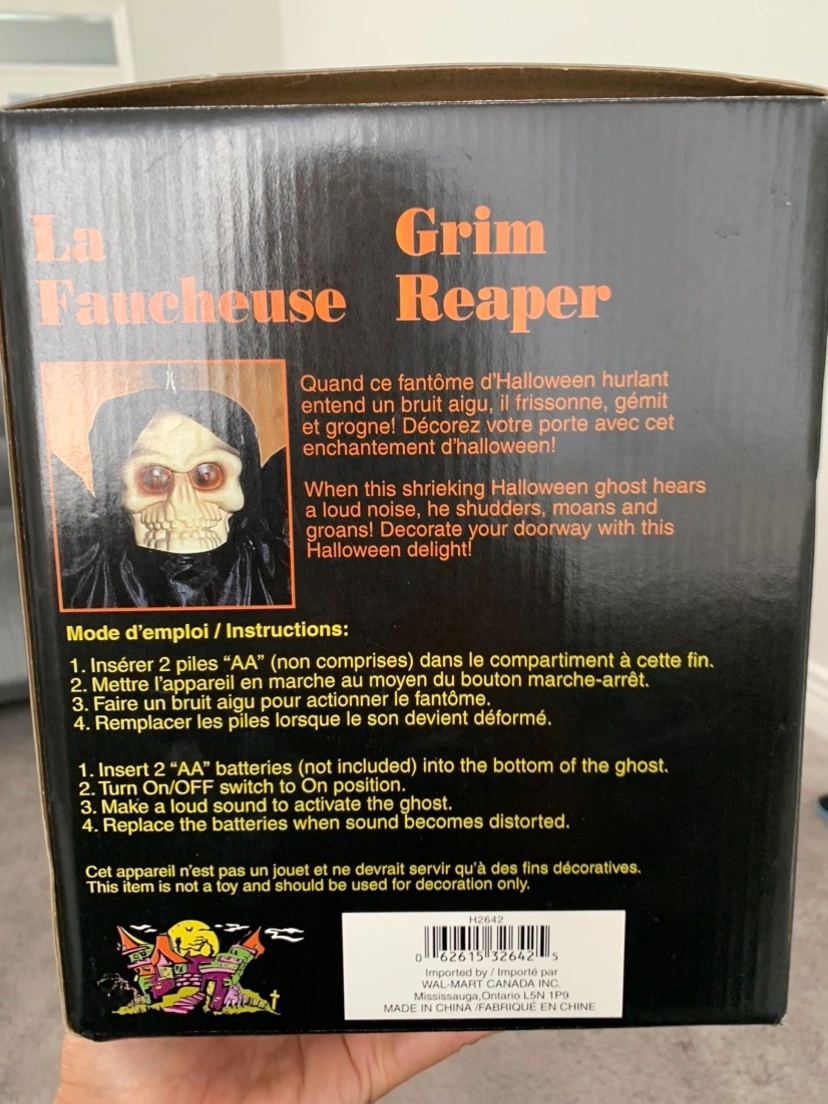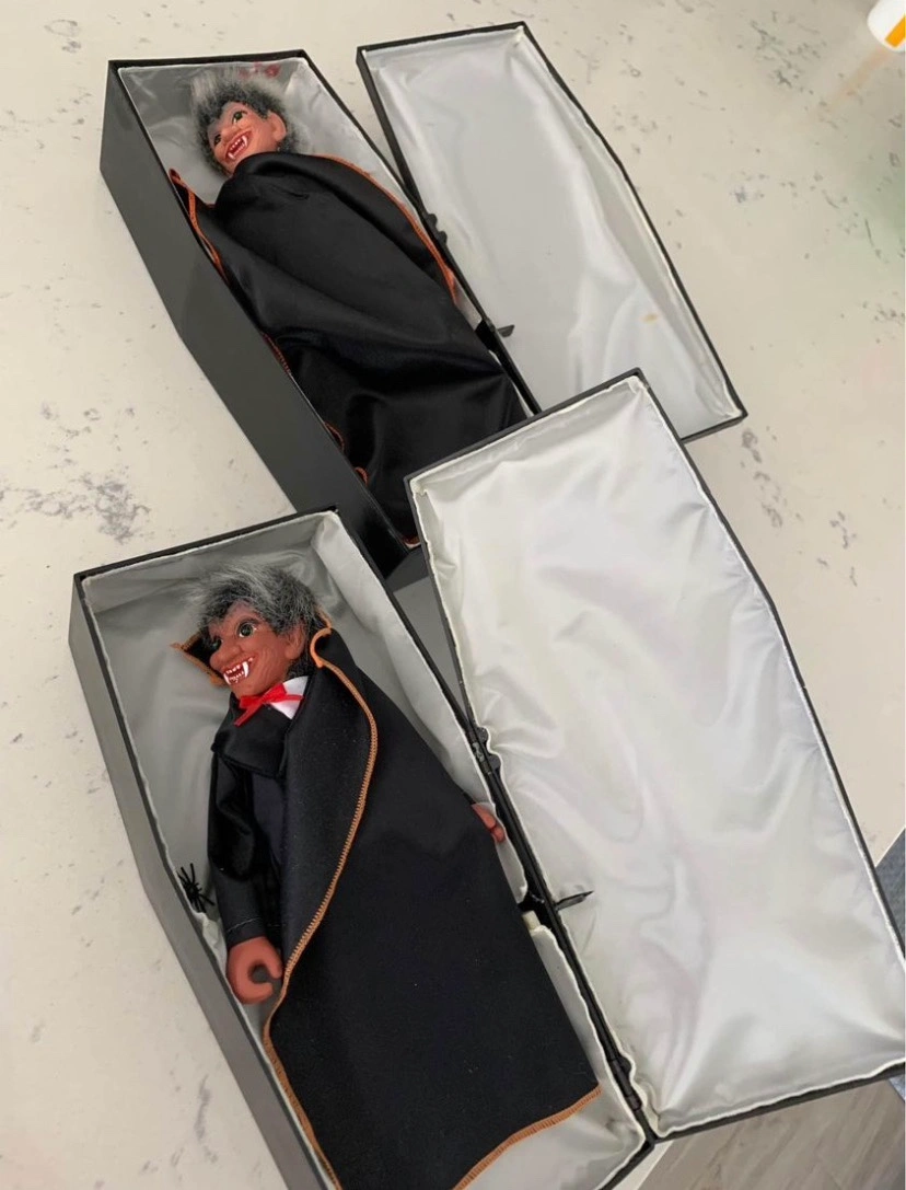 Skeleton vibrates, red eyes, plays creepy music $35 in original box. Draculas in coffins, flashing green eyes, one coffin plays creepy music, other coffin's lid automatically opens and closes and creeks $40 for both Draculas.