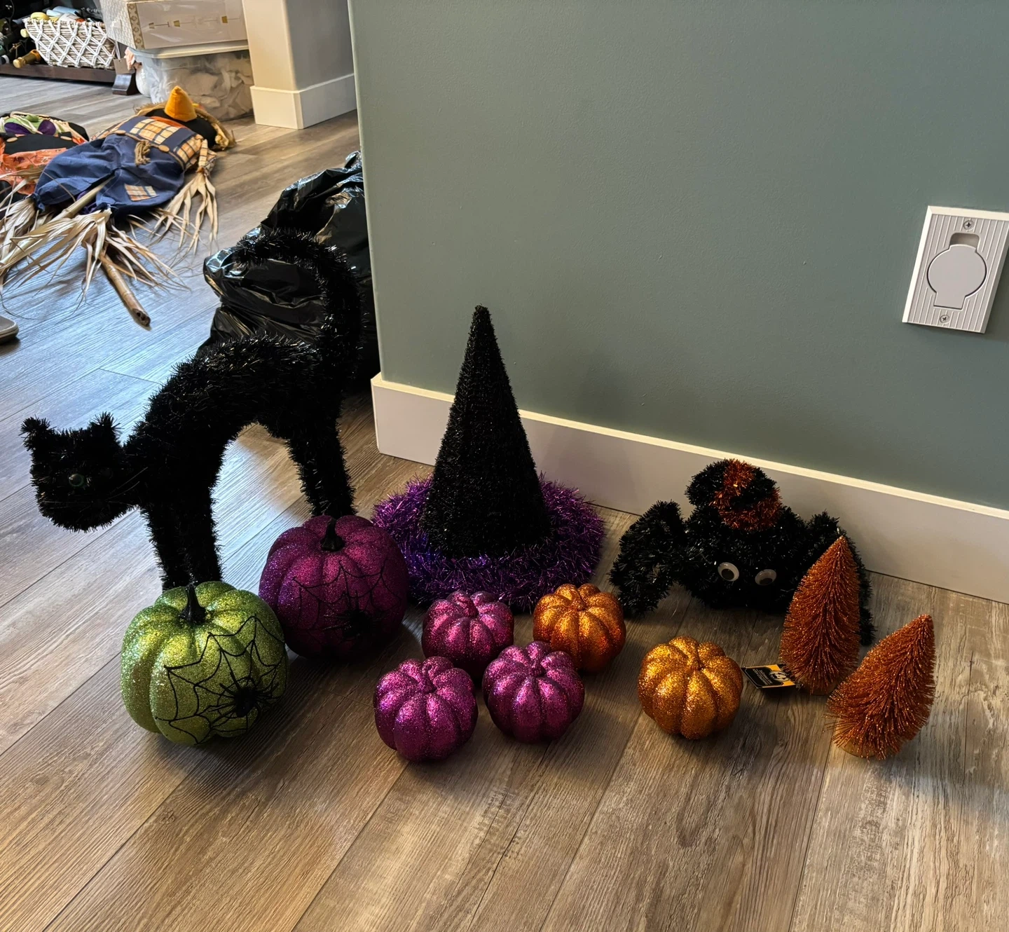 10Getting ready for Halloween? I have a set of Halloween decorations for sale. Includes a black cat, spider, pumpkins in various colours, and a witch hat. They're all in great condition and ready to add some spooky fun to your home!