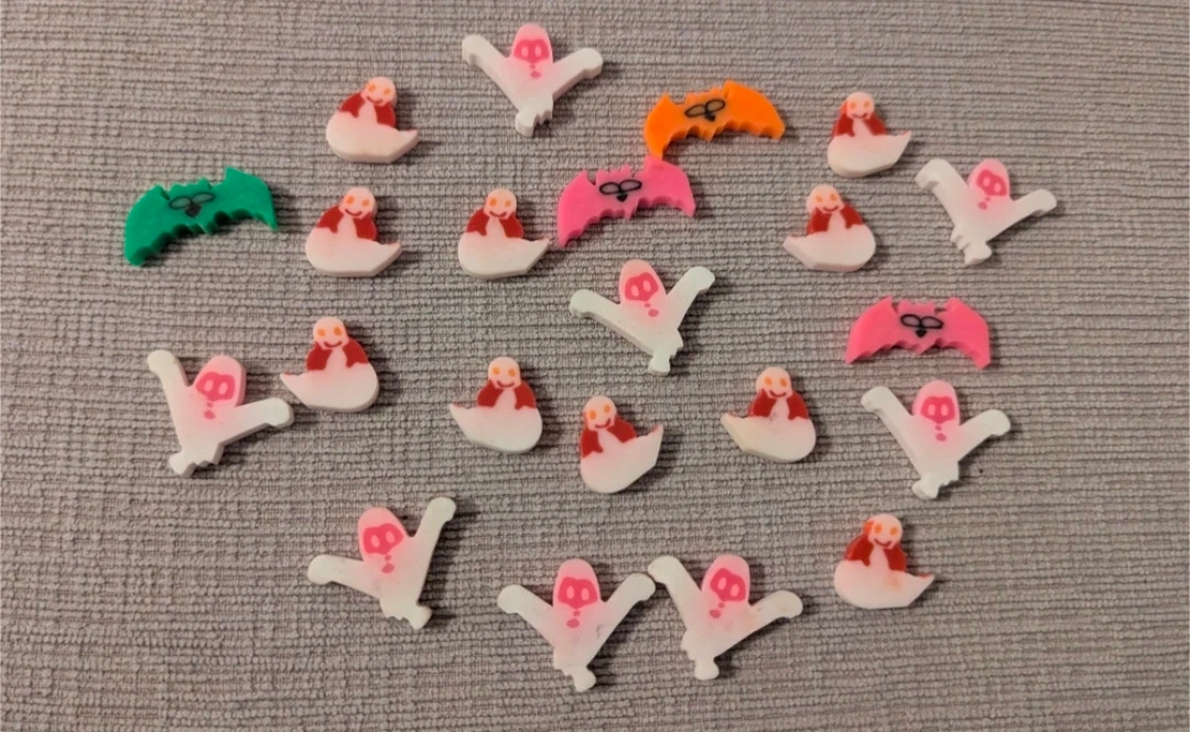 583Cute Halloween themed erasers! There are ghost and bat shapes in various colours. Perfect for party favours or just to add some spooky fun to your stationery collection
