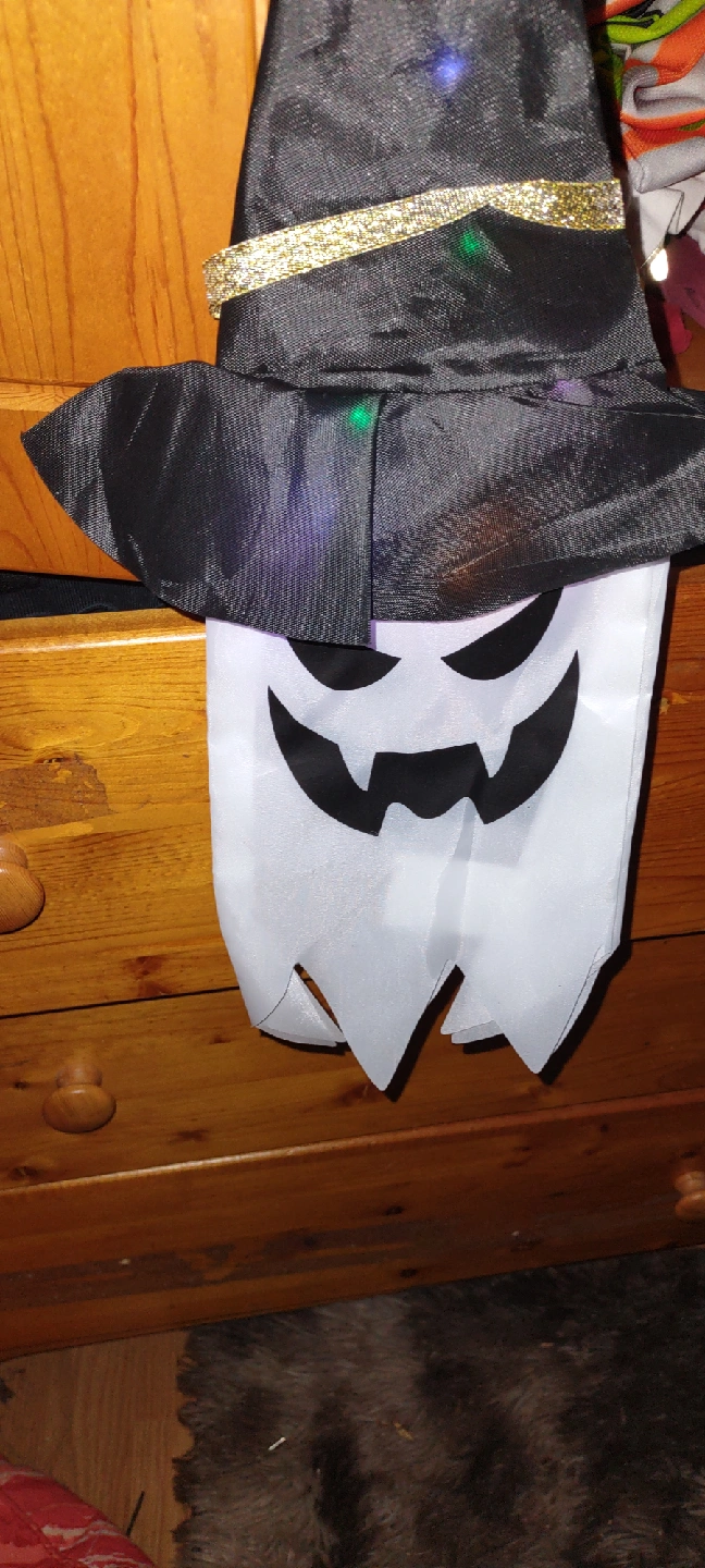 10A cute ghost decoration for Halloween! It features a black witch hat with a gold trim and a friendly ghost face. Perfect for adding a spooky touch to your home this Halloween season