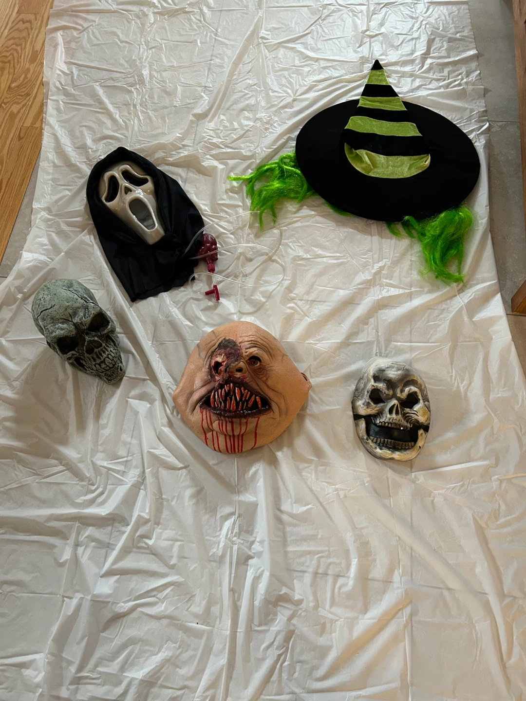 Selling a bundle of Halloween masks! Includes a Scream mask, witch hat, and skull masks. Perfect for Halloween or costume parties!