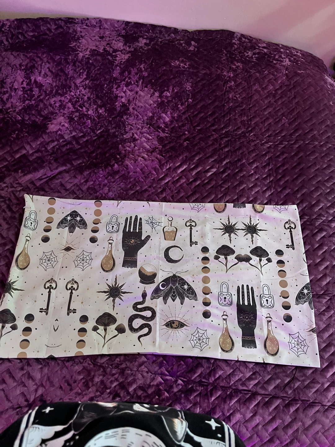 This pillow cover features a mystic print with keys, moons, and other symbolic designs. It's perfect for adding a unique touch as a cover to a decorative pillow (polyester fabric). Fits the larger longer sized pillows, 19in x 34 in. New, never used. Didn’t fit this years decor theme. For pickup in Parkdale near king st west and Jameson ave.