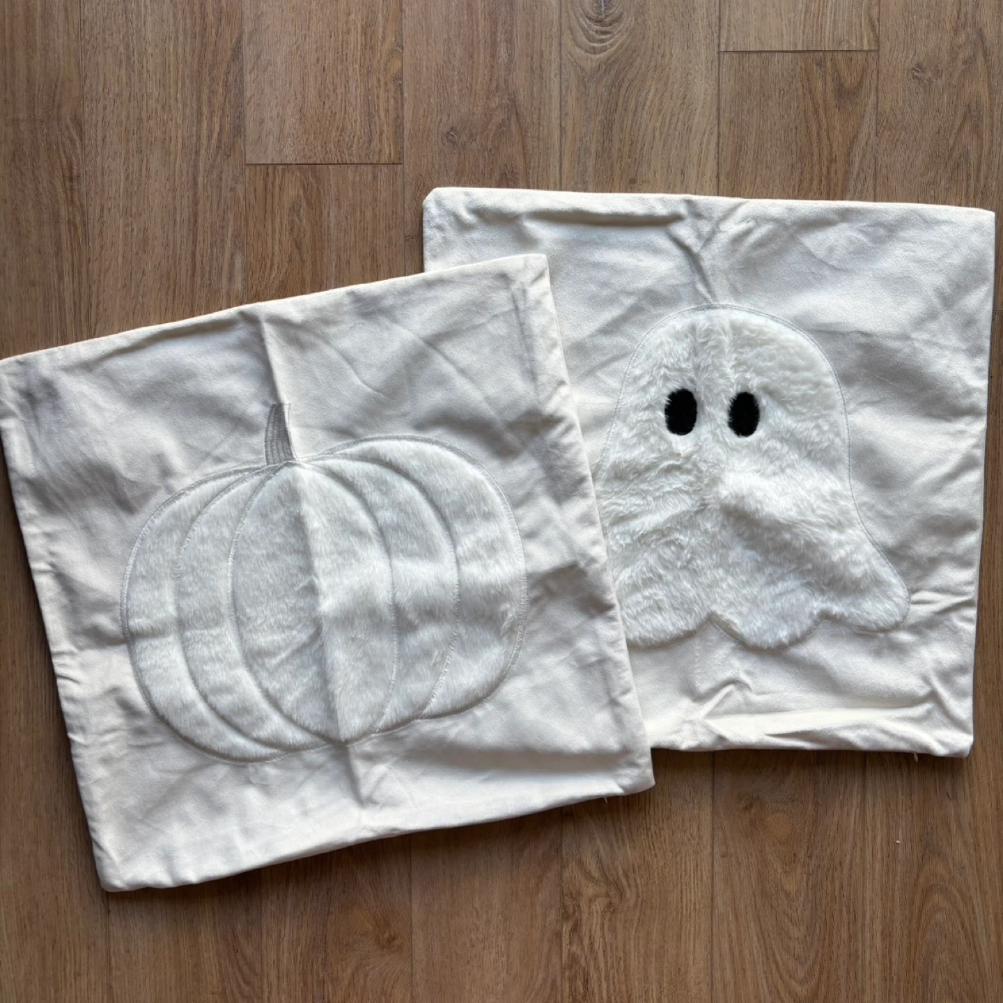 1000+Set of 2 Add a touch of spooky season charm to your home with these adorable Halloween pillow covers! One features a cute ghost design with fluffy texture, and the other has a classic pumpkin pattern. Perfect for adding a festive touch to your couch or bed Brand new condition. Velvety material