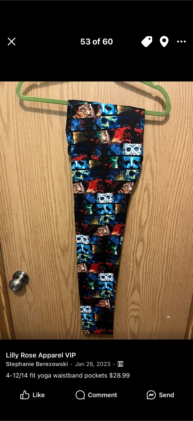 These Lilly Rose Apparel leggings are Brand New in Package . They feature a fun, colourful print and a comfortable yoga waistband. Size 4-12, with pockets. A great addition to your wardrobe! Pet Friendly/NS