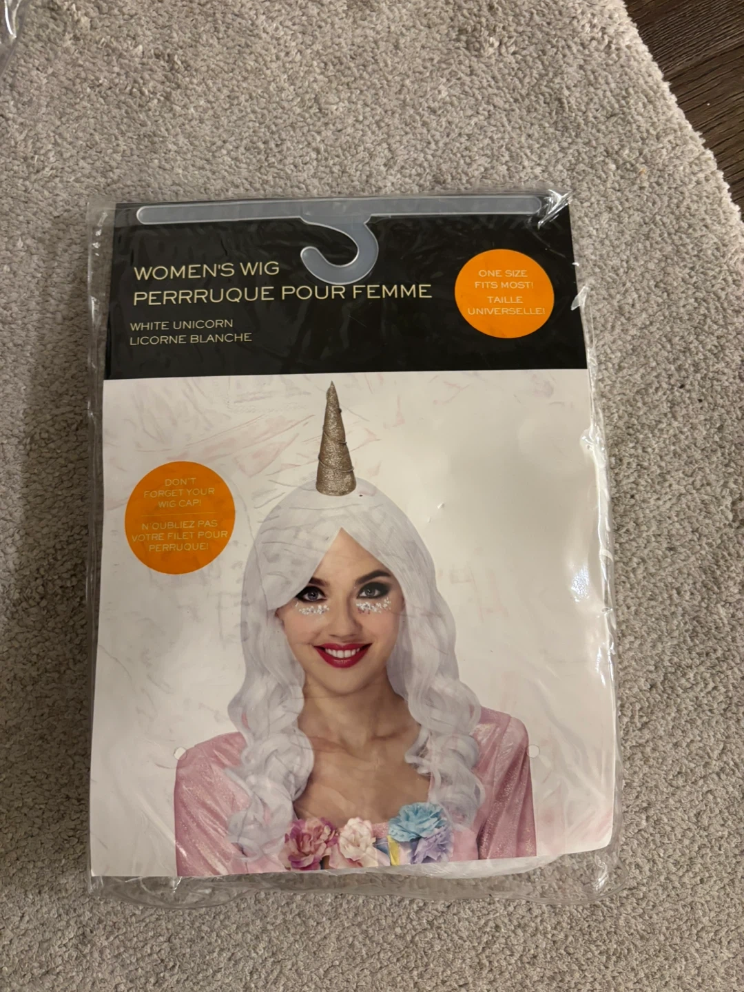 Selling a women's white unicorn wig, still in its original packaging! It's a fun accessory for costumes or dress-up. One size fits most, and it even reminds you not to forget your wig cap!