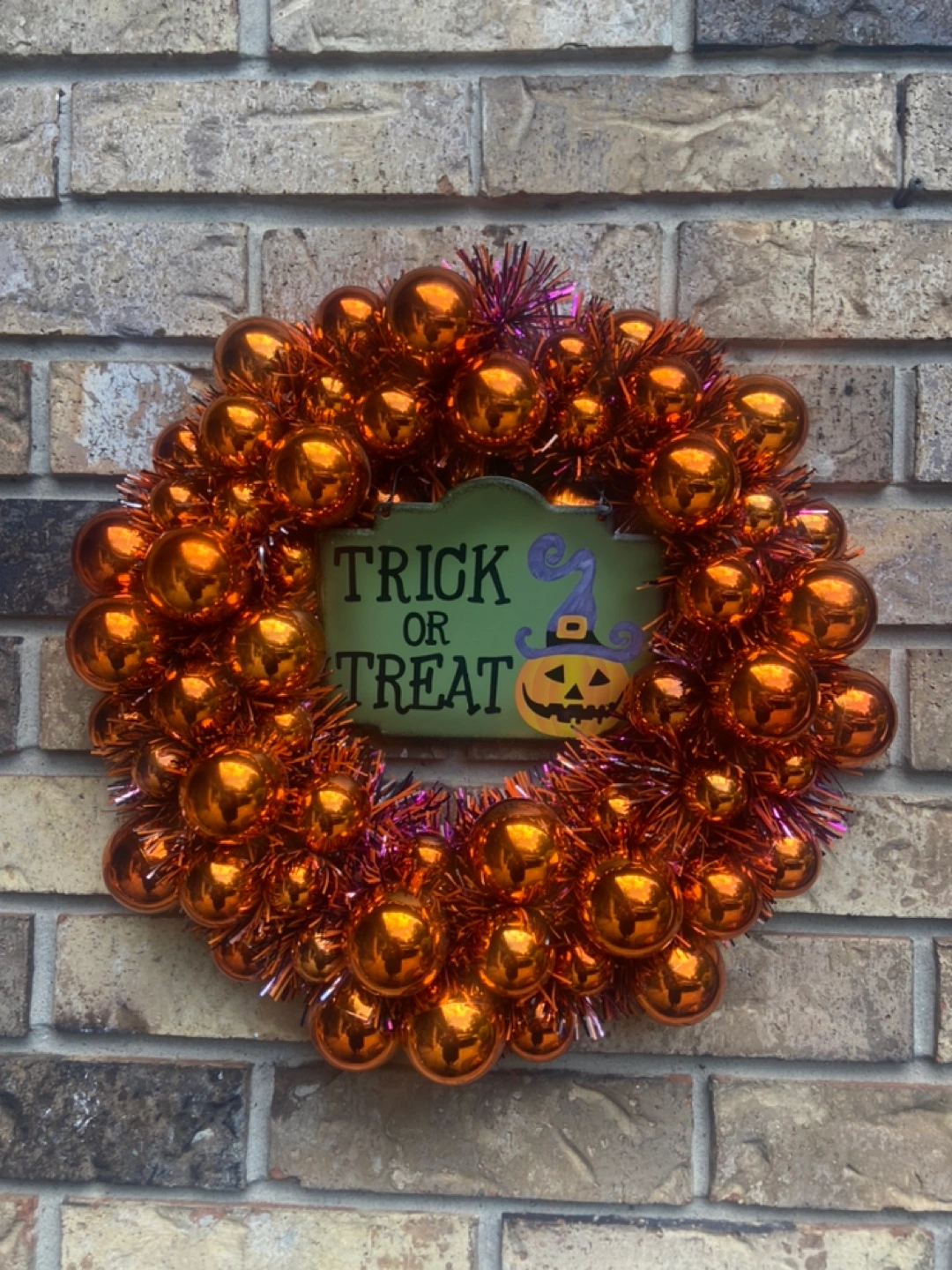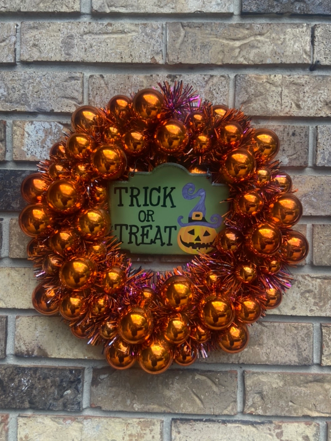 Get ready for Halloween with this festive wreath! It features a 'Trick or Treat' sign and is decorated with shiny orange balls and purple tinsel. Perfect for adding a spooky touch to your front door or any room in your home