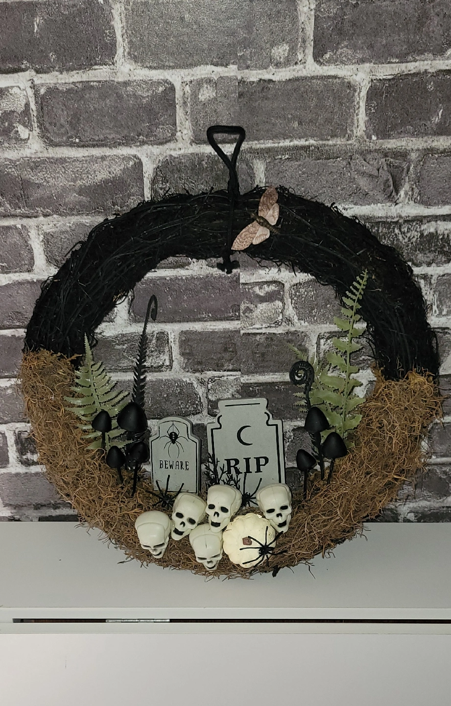 10Spooky Halloween wreath featuring skulls, tombstones, and spiders! Perfect for adding a touch of fright to your front door or haunted house