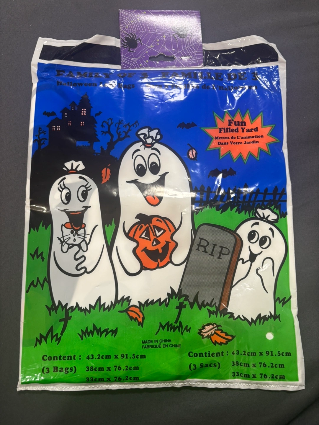 52Fun filled yard Halloween decoration. Includes 3 bags. Each bag measures 43.2cm x 91.5cm and 38cm x 76.2cm and 33cm x 76.2cm Pickup only