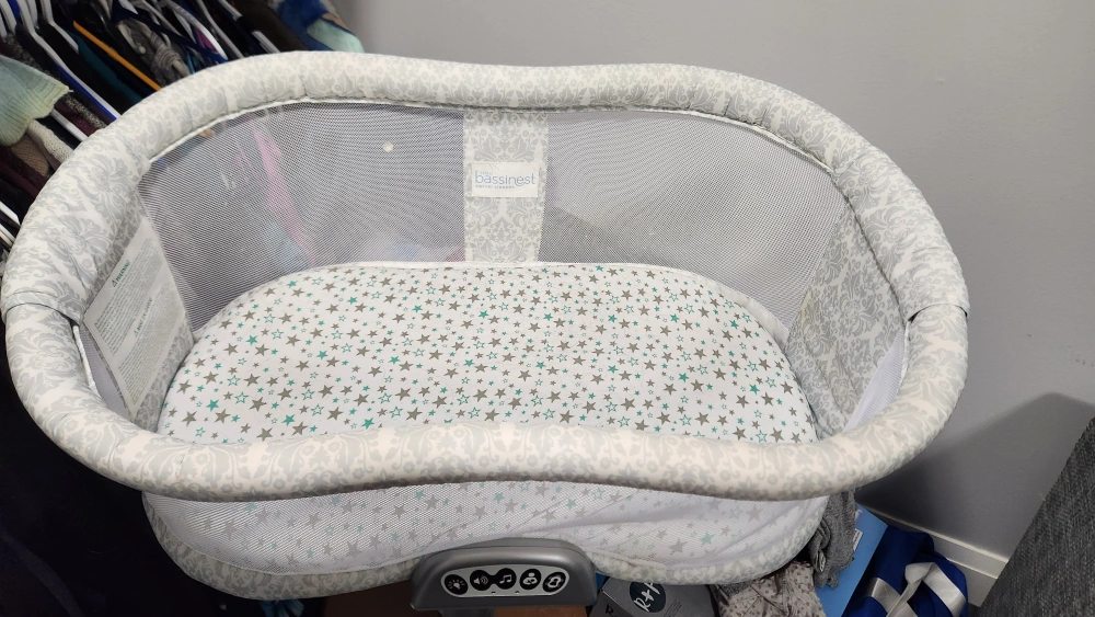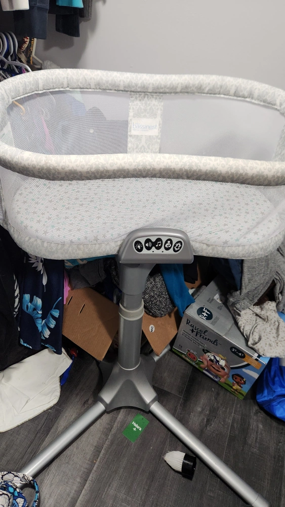 This item is in good condition and includes a bassinet with a swing feature. It has various settings, including sounds, lights, and vibrations. the side folds down for ease of removing babe in the night. Has waterproof cover and multiple sheets.