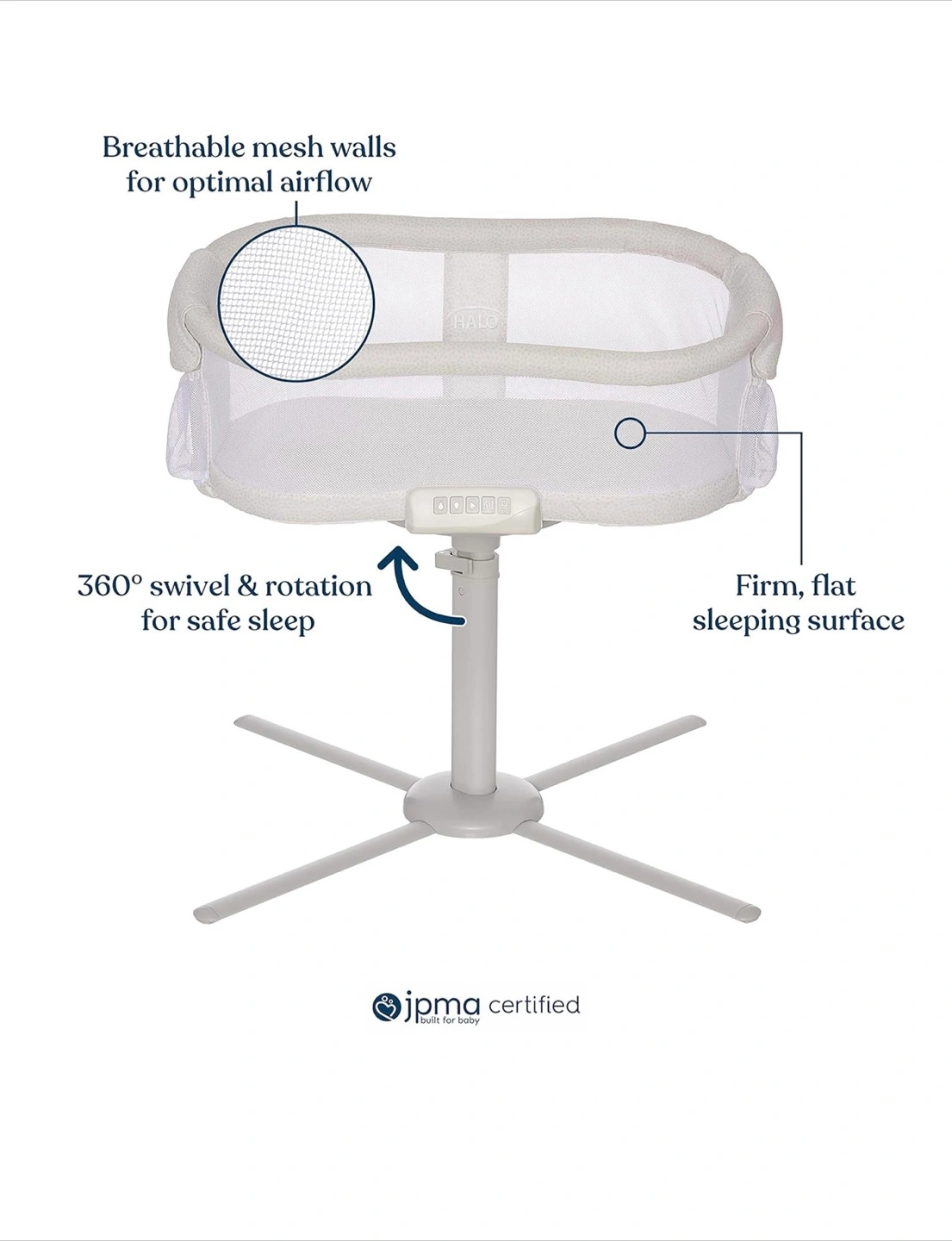 158Selling a Halo BassiNest Swivel Sleeper in great condition! It's perfect for keeping your little one close and safe during those early months. The breathable mesh walls ensure optimal airflow, and the 360° swivel and rotation make it easy to tend to your baby without getting out of bed. It also features a firm, flat sleeping surface for safe sleep