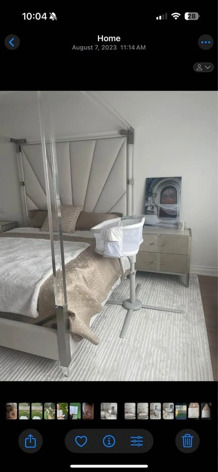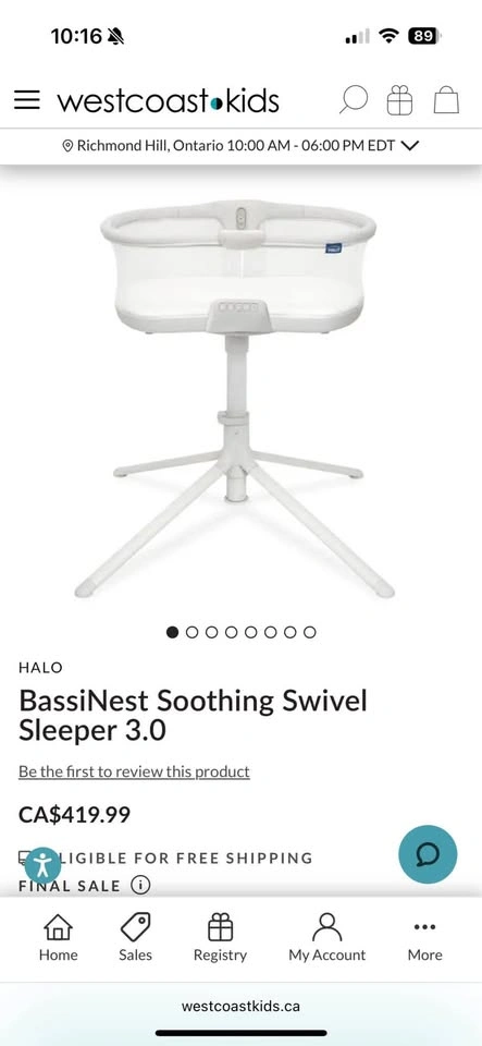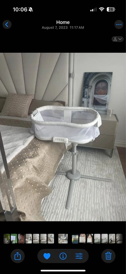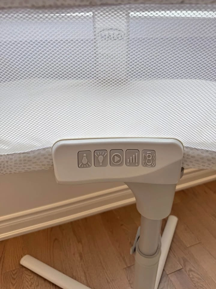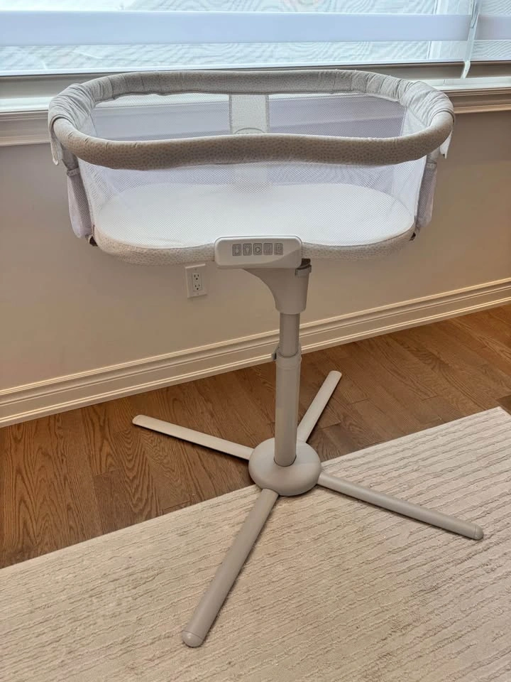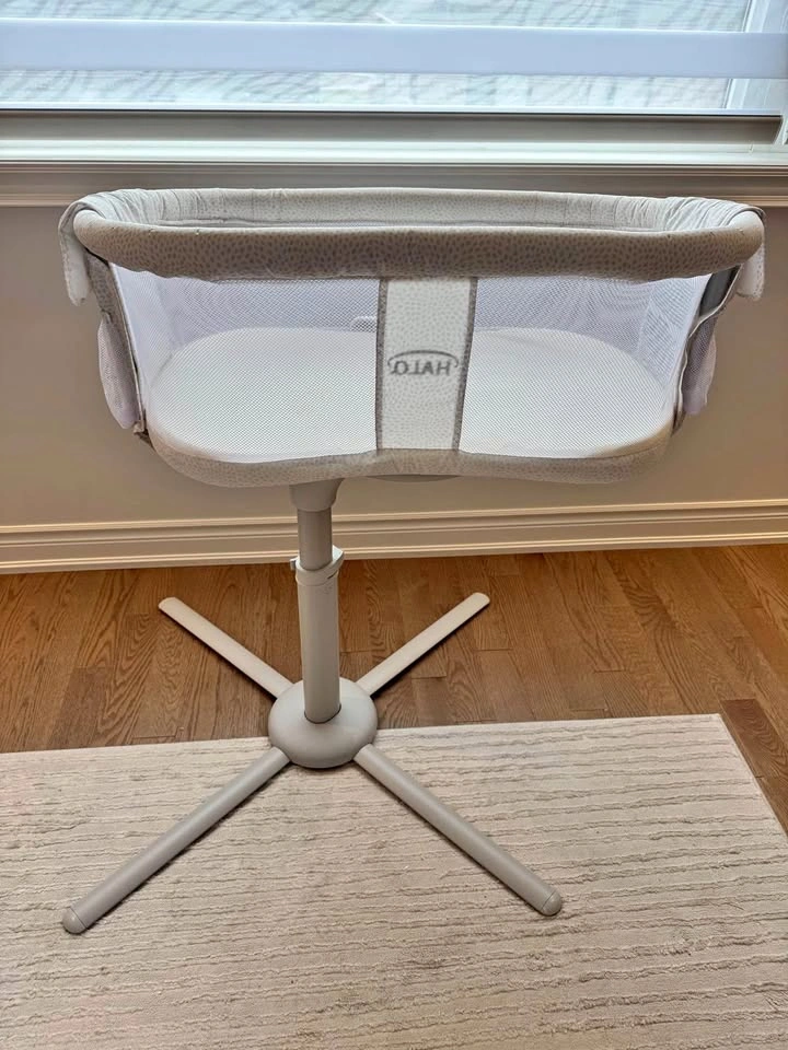 5Halo bassinet - never used, baby did not like to sleep in it. Co slept - bassinet sat in bedroom for a year. Swivel onto bed, has motion, night light and sound machine. Also adjustable height and 2 packets to store diapers and wipes.