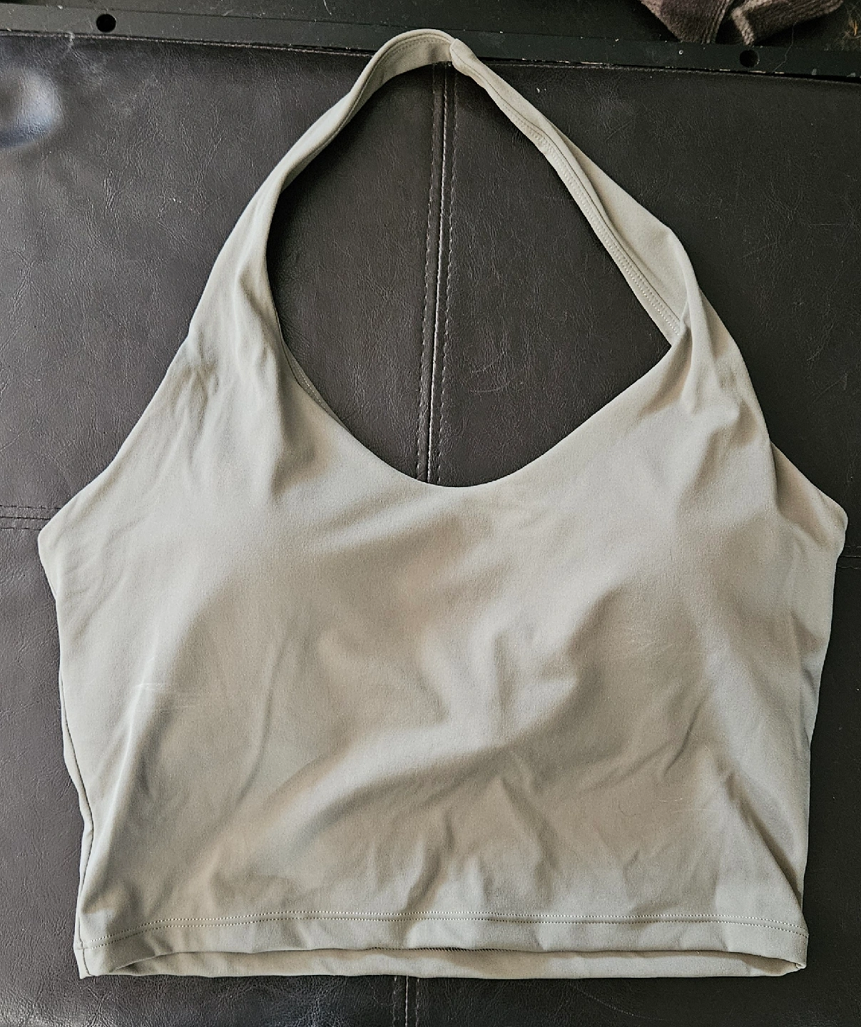 A comfy halter top in a lovely sage green colour! It's a versatile piece that can be dressed up or down. Perfect for summer days or layering in the cooler months. It's in great condition and ready for a new home!