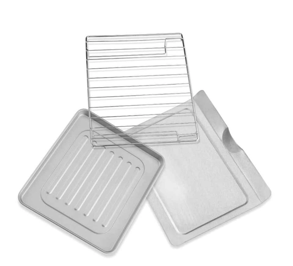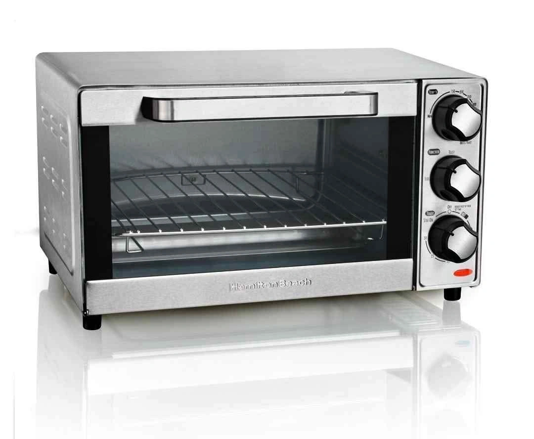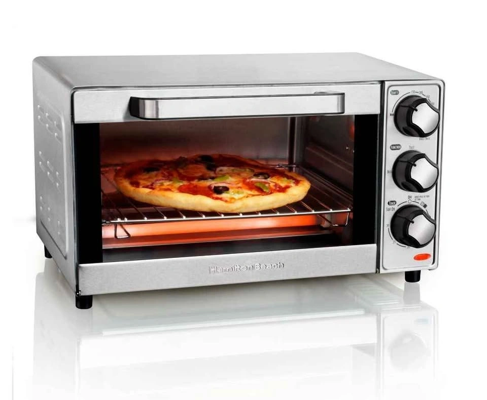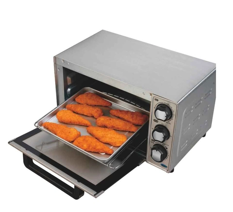 89Stainless steel exterior Adjustable Temperature Fits a 9 inch pizza, 2 open face sandwiches, 2 pork chops or chicken nuggets Toast, Bake, and Broil settings 30 minute cooking timer with automatic shutoff and ready bell Includes bake pan Nonslip feet