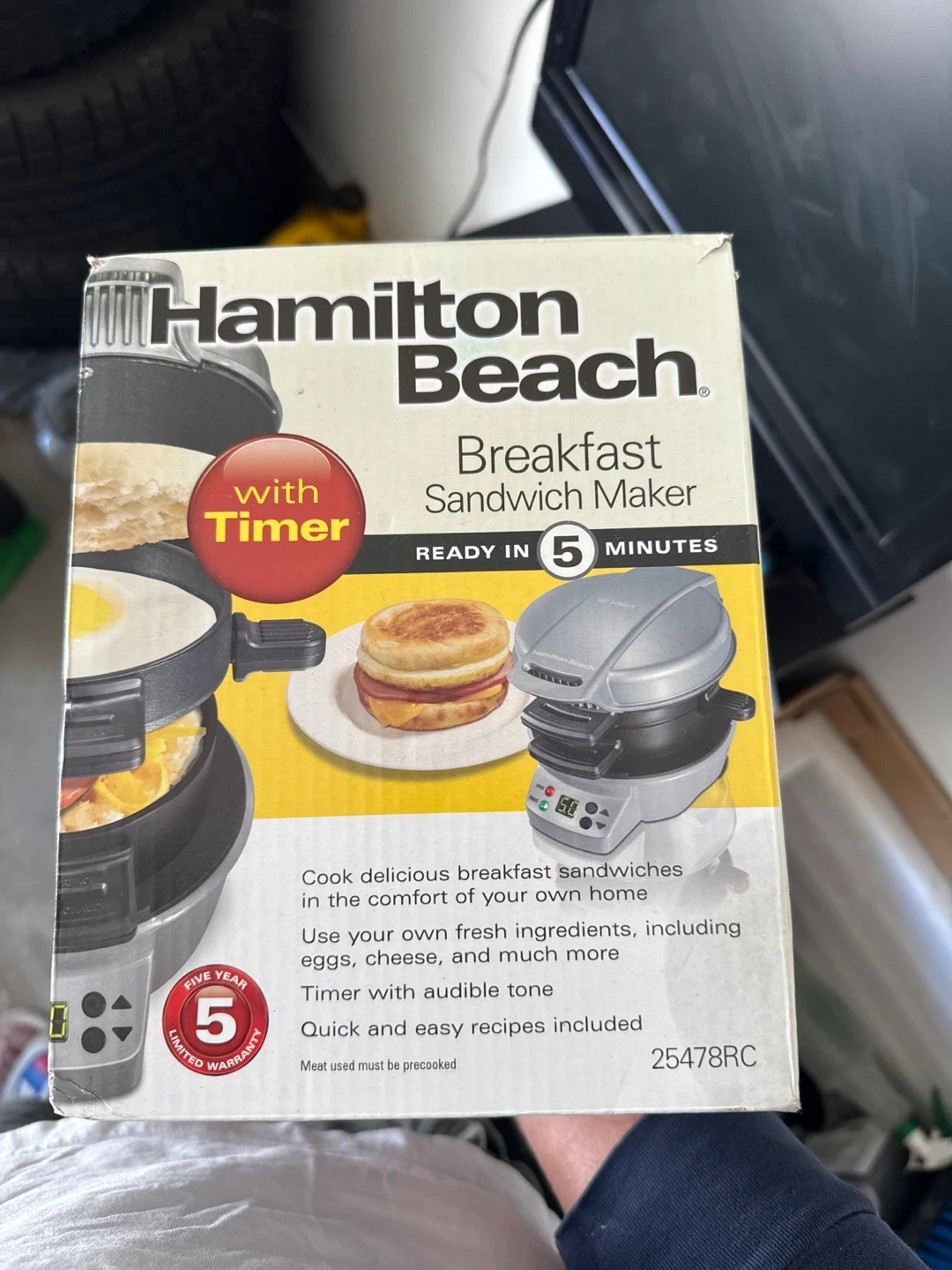 Make delicious breakfast sandwiches right at home with this Hamilton Beach Breakfast Sandwich Maker! It features a timer and audible tone, and all removable parts are dishwasher safe for easy cleanup. Quick and easy recipes are included to get you started. Comes with the original box!
